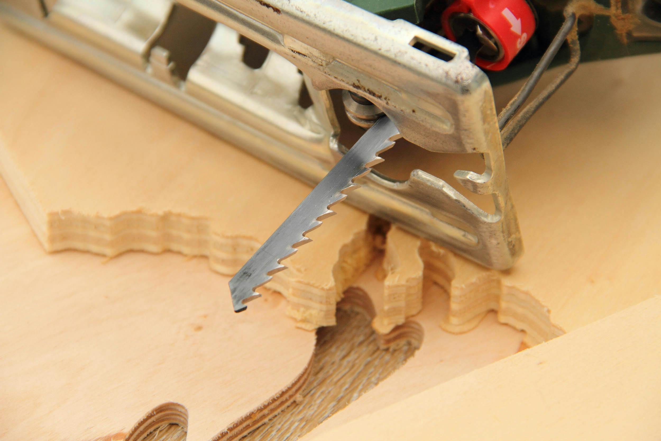 Het voornaamste zaagwerk wordt gedaan door de opgaande beweging van het zaagje. Andersom zou het zaagje de machine namelijk steeds van het werkstuk af drukken. Om die reden staan de tanden naar boven gericht. Eventuele beschadigingen zijn daardoor wel zichtbaar op de kant die je naar je toe hebt gekeerd, vooral wanneer je met zacht of samengesteld hout werkt (zie de foto hieronder). Leg de plaat daarom met de mooie kant naar beneden.