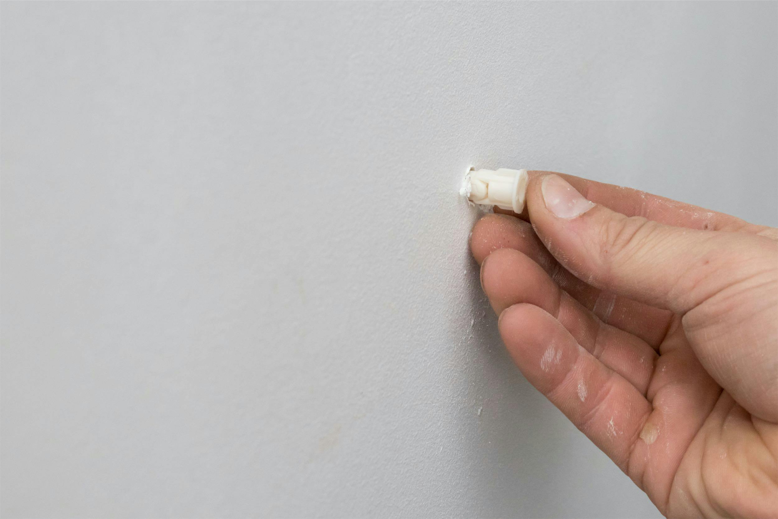 Je hebt nu een gat in de muur dat net zo wijd en iets dieper is dan de plug. Als het goed is klemt de plug daarom meteen. Het kan daardoor lastig zijn om deze in het gat te krijgen. Gebruik voor het laatste stukje desnoods een hamer en tik de plug het gat in.
