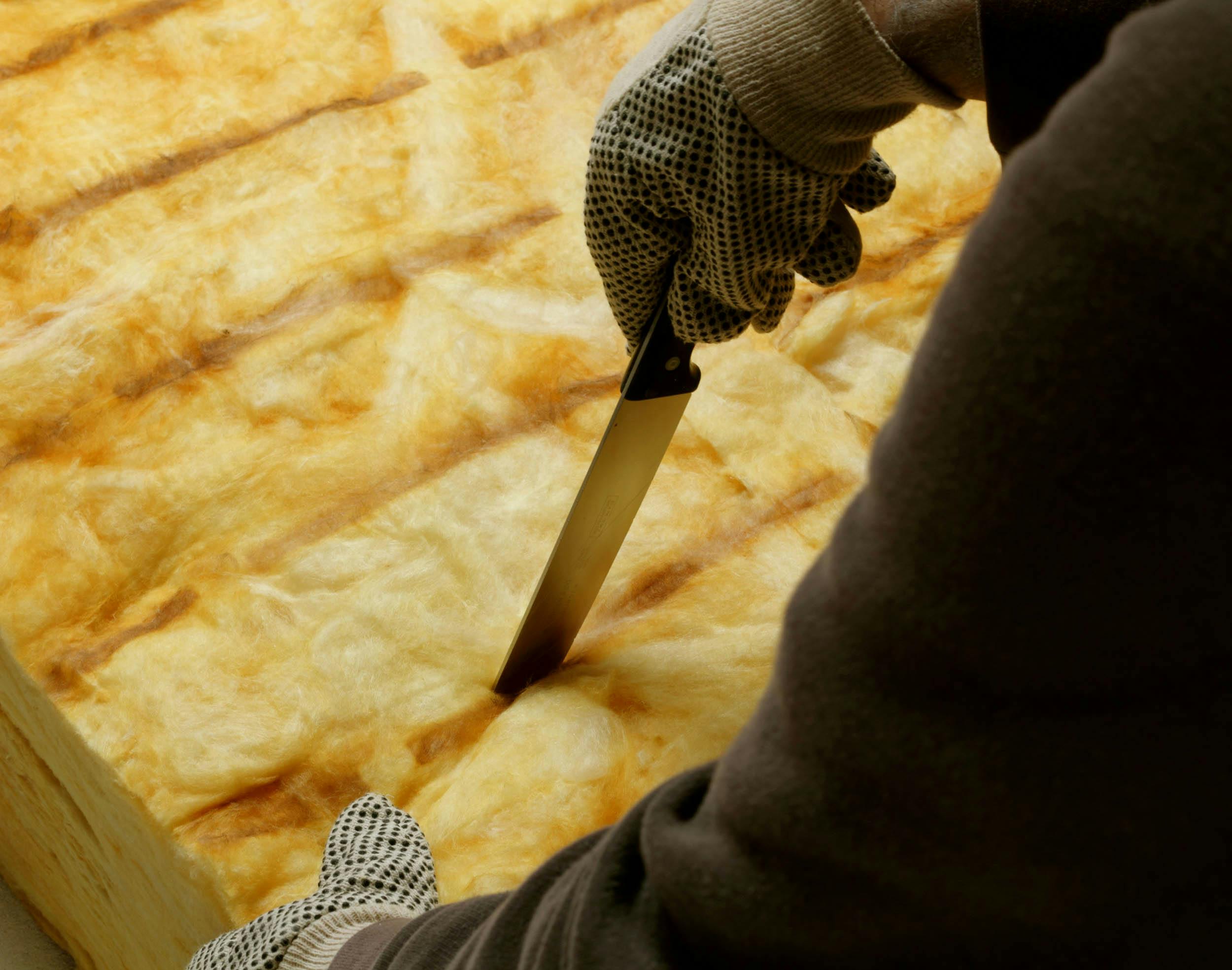 Meet allereerst de afstand tussen twee balken. Daar gaan we de glaswol tussen klemmen. Snij het materiaal 2 centimeter breder af, zodat het automatisch klemt. Daarvoor gebruik je idealiter een isolatiemes, maar een broodmes werkt ook.