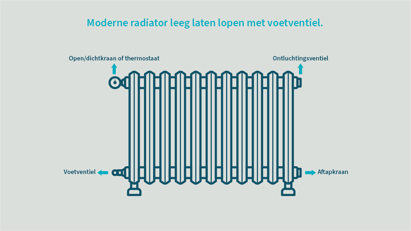 ☐ het voetventiel: afvoer van de radiator, zit recht onder de radiatorknop;