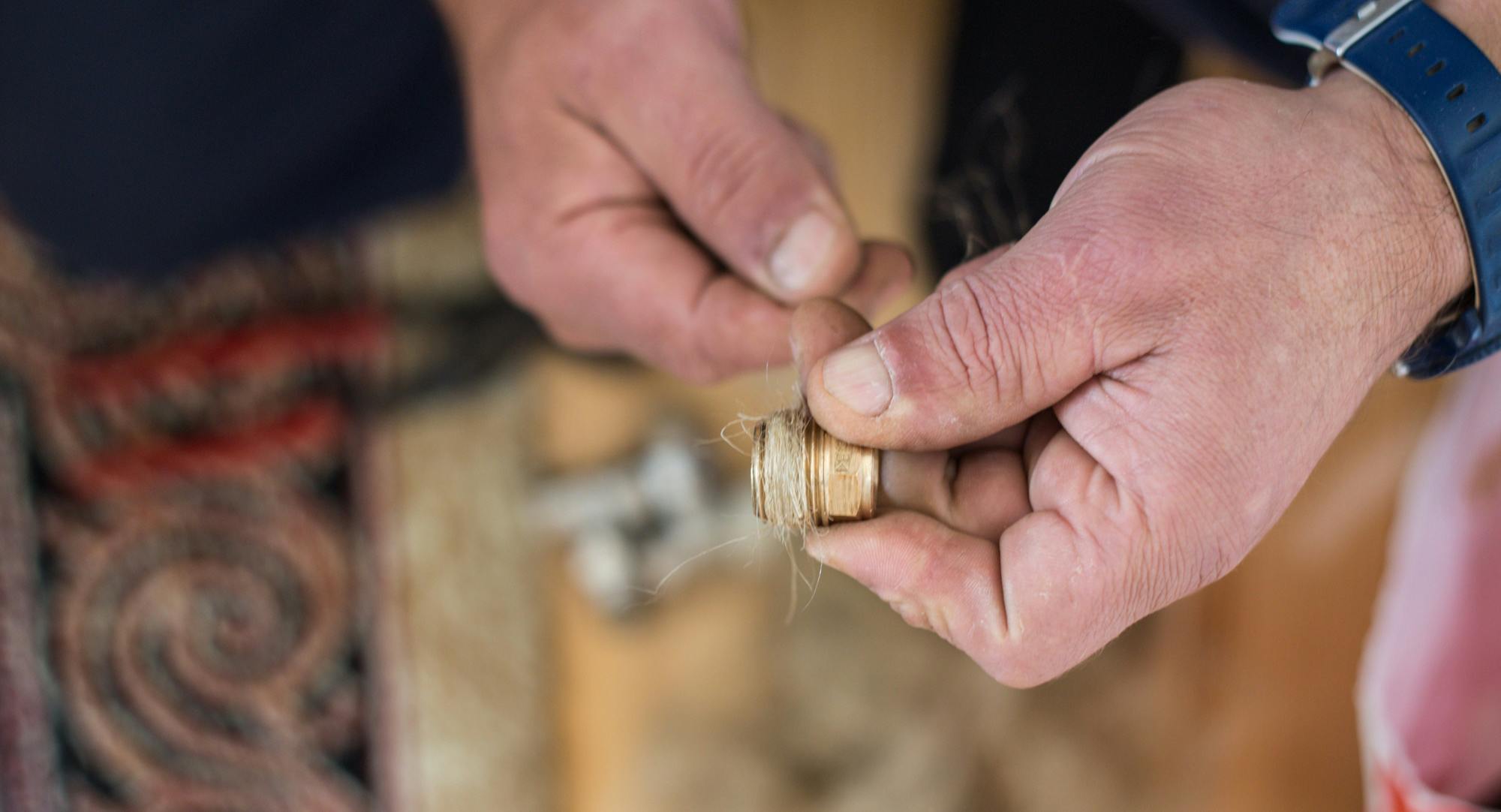 Nu beginnen we met de reparatie. We gebruiken hennepdraad en afdichtingspasta om een lek te dichten. Teflontape wordt ook weleens als oplossing genoemd. Maar dat is toch een stuk minder betrouwbaar. Je koopt hennepdraad bij iedere bouwmarkt, soms onder de naam vlas. Hetzelfde geldt voor afdichtingspasta, dat ook als fitterskit bekendstaat. Draai het lekkende verbindingsstuk open. Wikkel daar vervolgens een plukje hennepdraad omheen, met de schroefdraadrichting mee (kloksgewijs).