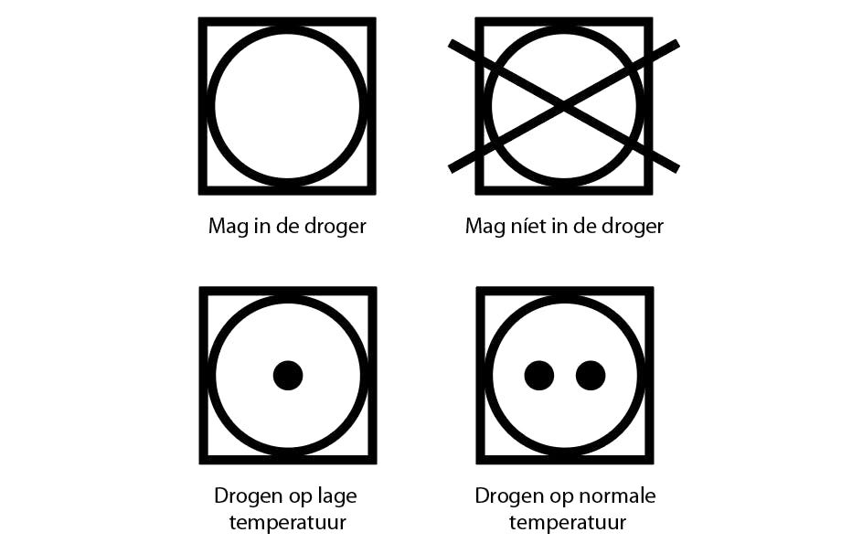 In principe kunnen alle kledingstukken die op een hoge temperatuur (60 graden of hoger) gewassen mogen worden, ook in de droger. Soms is het heel fijn om textiel in de droger te kunnen stoppen. Denk bijvoorbeeld aan katoenen beddengoed, theedoeken en handdoeken, die in de droger zacht worden en dat ruwe gevoel van een aan de waslijn gedroogde handdoek niet krijgen. Voor katoenen sokken en ondergoed geldt hetzelfde, maar let op bij kwetsbare kledingstukken zoals ondergoed van zijde of kant. Het is beter om deze kledingstukken liggend te laten drogen. Synthetische stoffen zoals sportkleding of leggings zijn meestal ook geschikt voor de droger, maar controleer altijd eerst het waslabel om dat zeker te weten. In de afbeelding zie je welke symbolen voor de wasdroger je op het waslabel kunt tegenkomen.