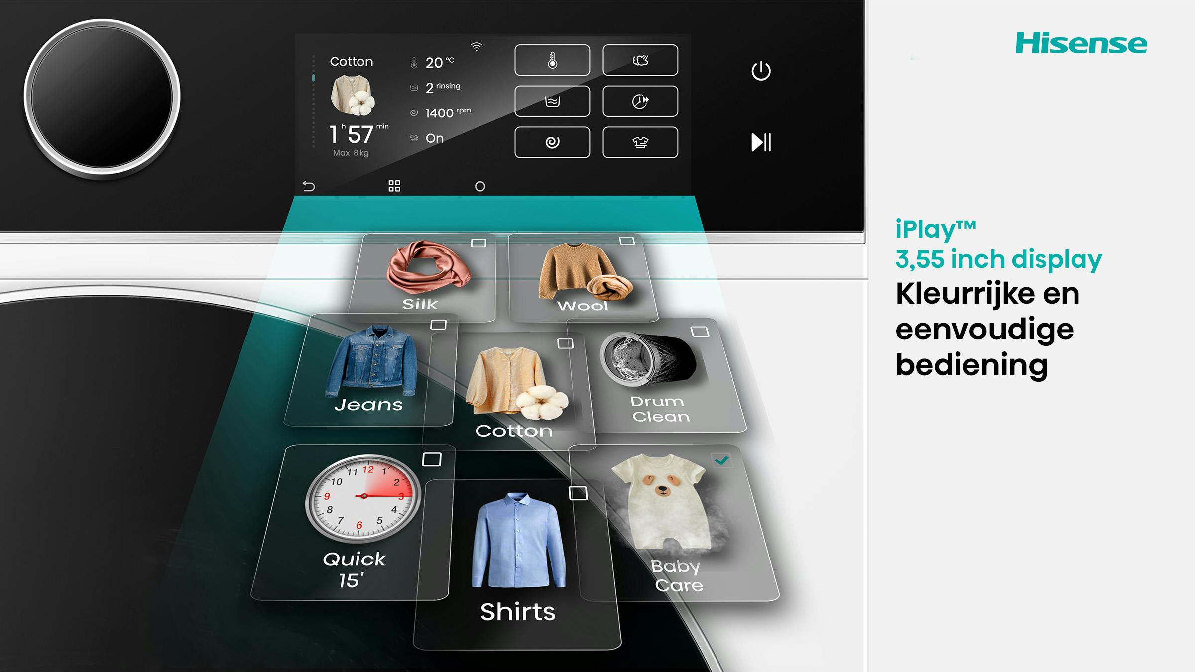 Vergeet ingewikkelde knoppen en onduidelijke symbolen. Met het slimme iPlay™ kleurentouch-display bedien je jouw wasmachine net zo intuïtief als je smartphone. In je eigen taal swipe je soepel door de programma's, check je de voortgang en pas je instellingen aan. Het ziet er niet alleen strak en modern uit, maar maakt elke wasbeurt stressvrij en overzichtelijk.
