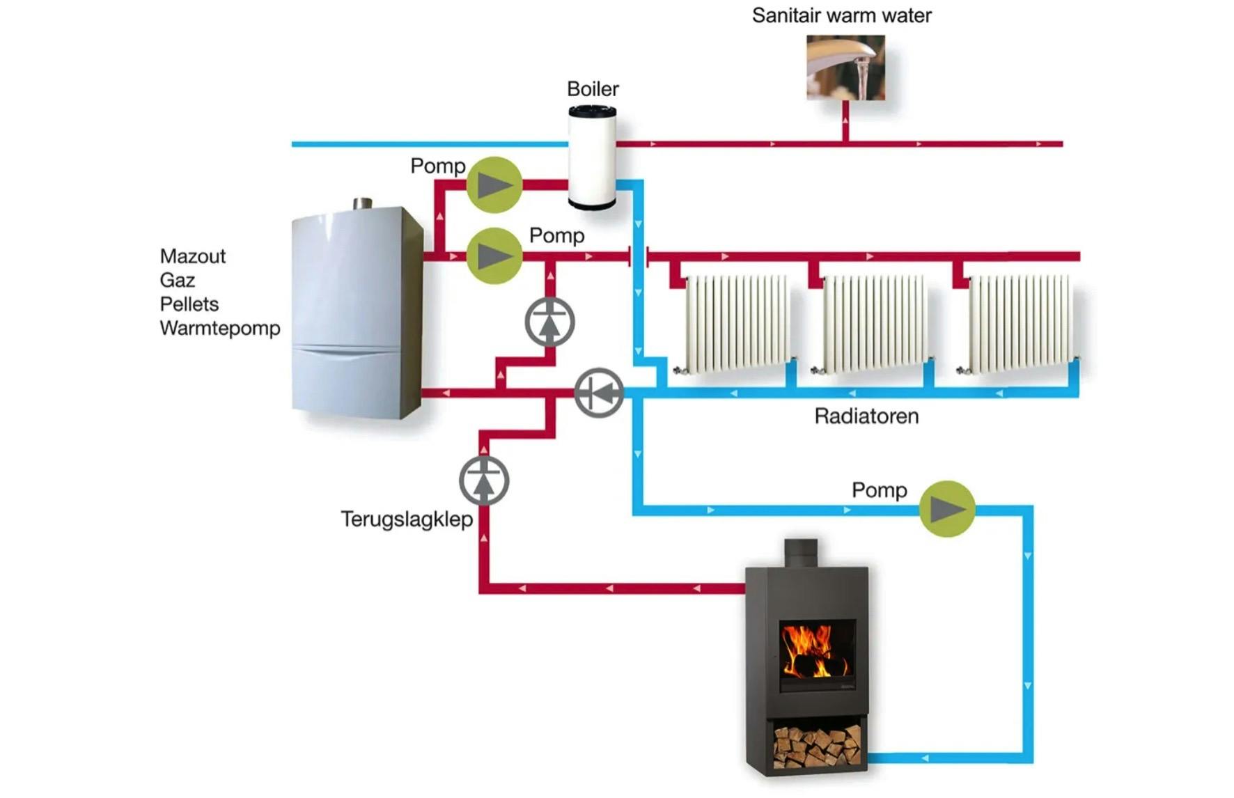 Ruwweg kunnen we de werking verdelen in twee basissystemen. In een bestaande woning met radiatoren worden de leidingen die uit de kachel komen, aangesloten op de cv-ketel. Op die manier nemen de radiatoren de energie rechtstreeks over. Wanneer het in huis voldoende warm is, valt de cv-ketel stil. Het is dus belangrijk dat de cv-kachel goed is gedimensioneerd. Dat betekent dat het vermogen van de cv-kachel is afgestemd op het vermogen van de ketel.
