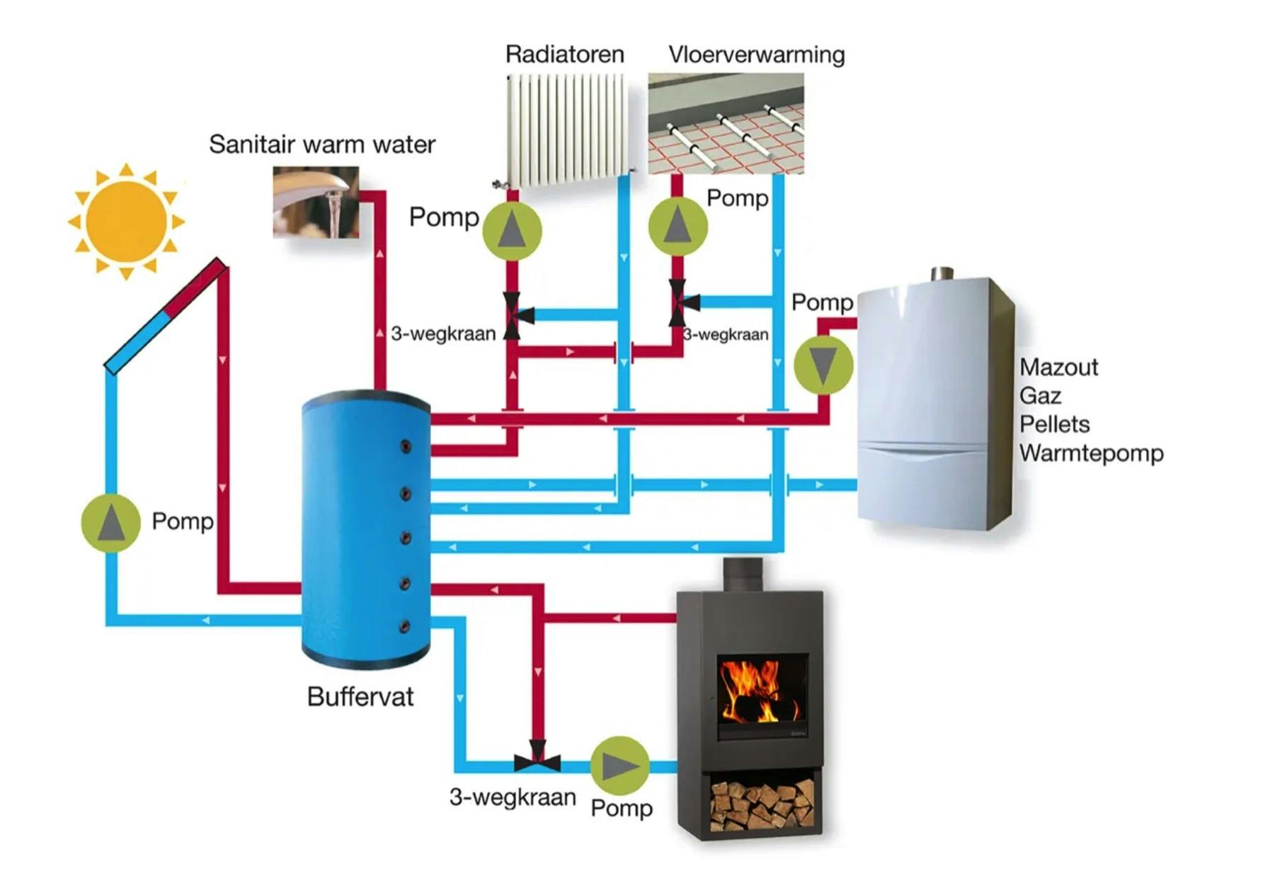 Het tweede systeem is bedoeld voor nieuwbouw met vloerverwarming. Daar werkt men met een buffervat van 500 à 800 liter. De cv-kachel verwarmt het water in het buffervat en daarvandaan wordt de warmte verdeeld naar de vloerverwarming. Zo'n buffervat kan ook worden aangesloten op een warmtepomp, zodat er altijd voldoende warm water is.