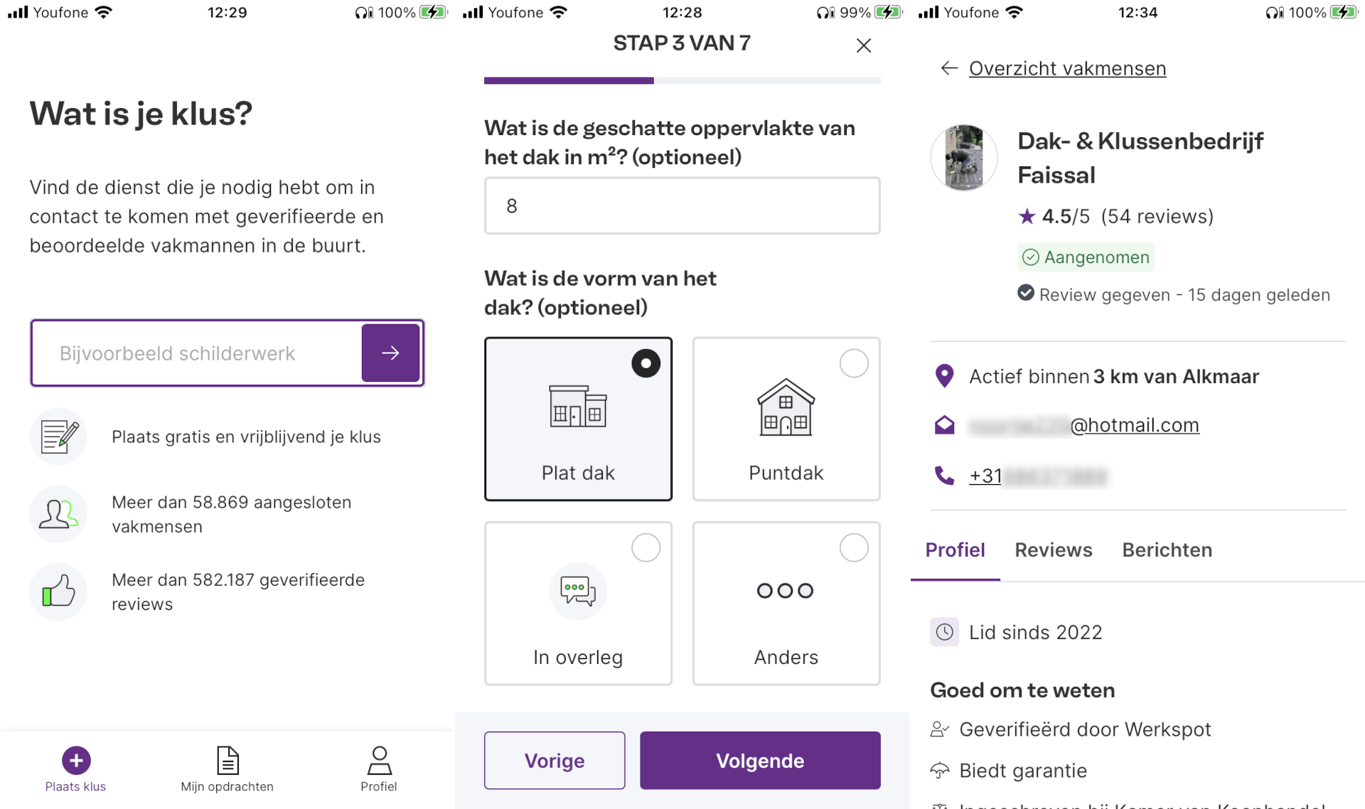 Een andere manier om snel een lokale dakdekker te vinden, is het gebruik van Werkspot (Android/iOS). Plaats in deze gratis app een oproep met een nauwkeurige omschrijving van de klus en zie welke bedrijven er op korte termijn tijd hebben. Je leest vervolgens reviews, waarna je met een bekwame vakman contact opneemt.