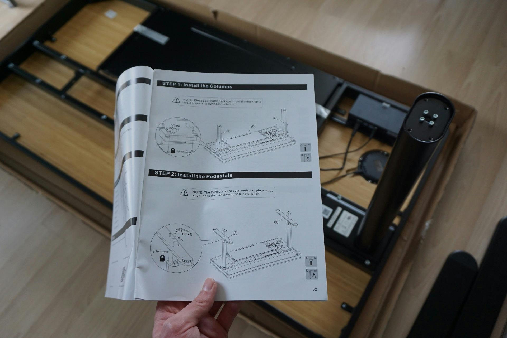 Het installeren van het bureau start bij het uitpakken van de twee pakketten. Een bevat het bureaublad – in de Q8-versie altijd van lichtbruin bamboe – en het andere bevat de twee poten. Die zijn zwart of wit, afhankelijk van je bestelkeuze. De installatie spreekt voor zich omdat het meeste voorwerk al gedaan is, de benodigde montagestappen eenvoudig zijn en Flexispot naast een prima handleiding ook de vereiste schroevendraaier en ander materiaal meelevert. Het in elkaar zetten van het bureau heeft mij dertig minuten gekost en ik heb dit alleen gedaan. Flexispot raadt aan het bureau samen met iemand anders te monteren, met name om het bureau vlot te kantelen. Dit is – zo kan ik toevoegen – nogal zwaar om alleen te doen, zeker als je je vloer niet wil beschadigen.