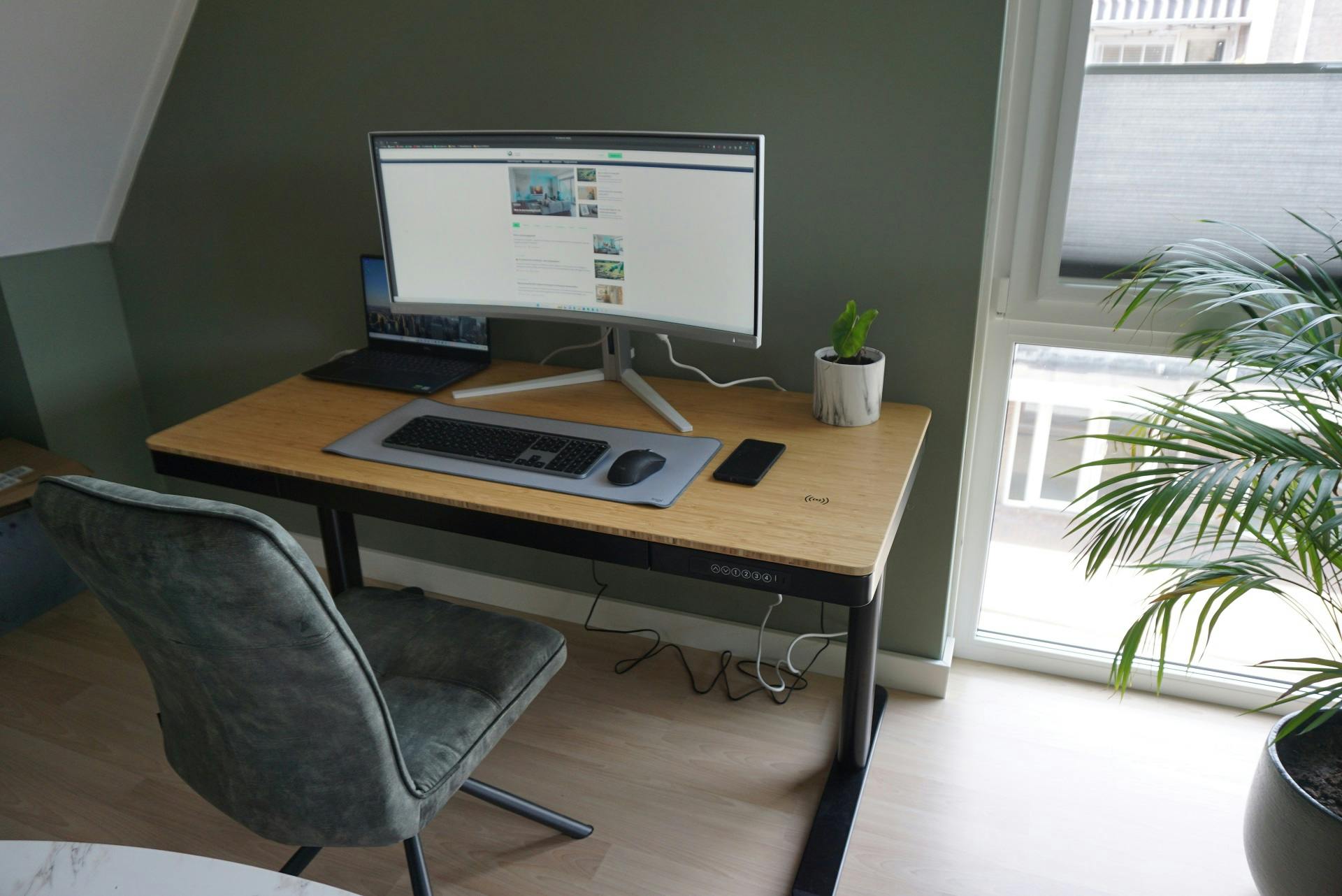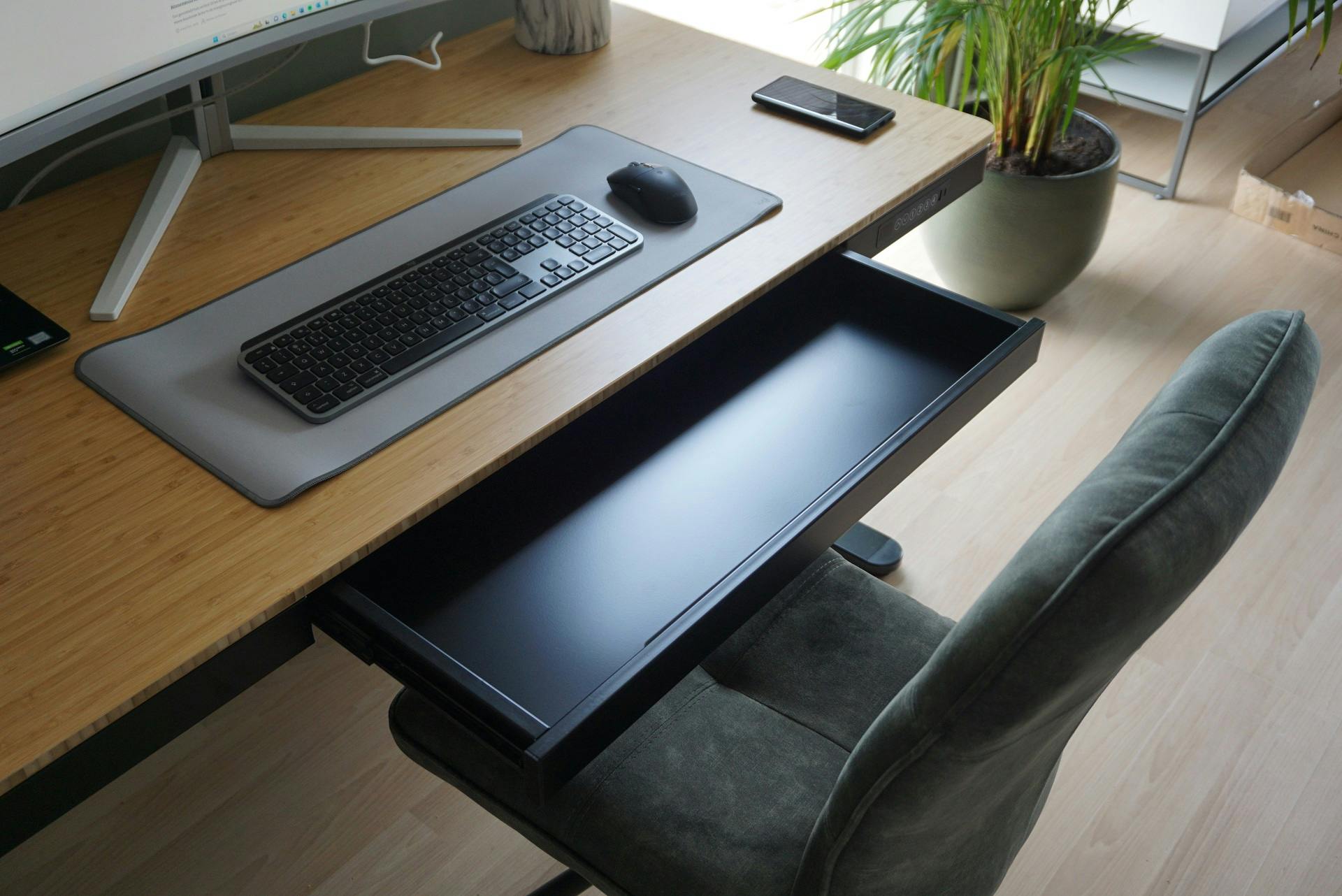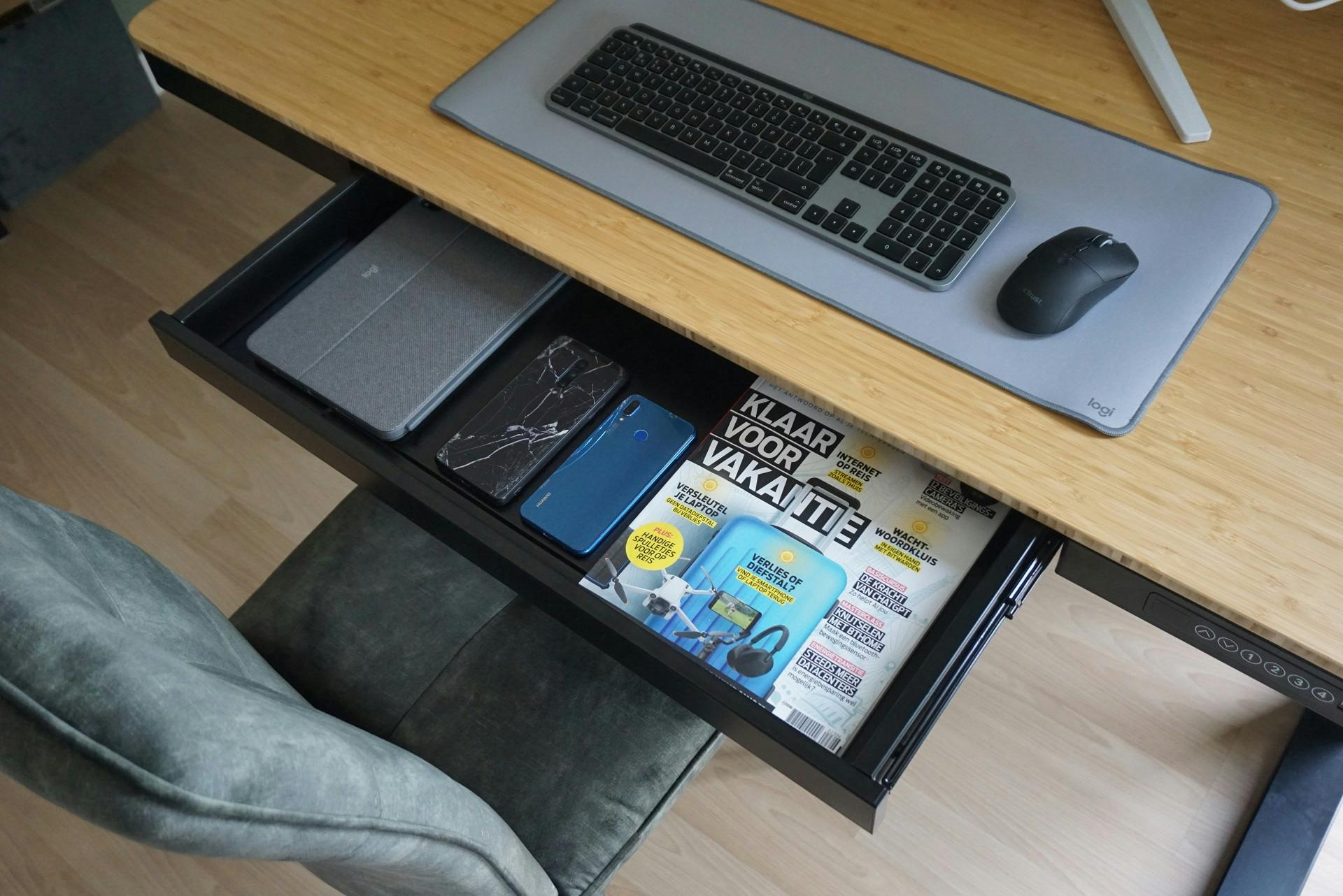 Het bureau komt ook erg degelijk over. Ik ben erg gecharmeerd van het bamboeblad, dat luxe aanvoelt en een prettige ondergrond voor mijn handpalmen vormt. Het frame van de Q8 is ook sterk en eenvoudig te reinigen met een stofdoek. Heel prettig vind ik de lade aan de voorkant van het bureau. Deze lade (66 centimeter breed, 31 centimeter diep en 5 centimeter hoog) is groot genoeg om mijn iPad, kabels en een notitieboek op te bergen. Door een soft close-mechanisme sluit de lade altijd zachtjes. Dit soort slimmigheden draagt bij aan de luxe gebruikservaring van het bureau.