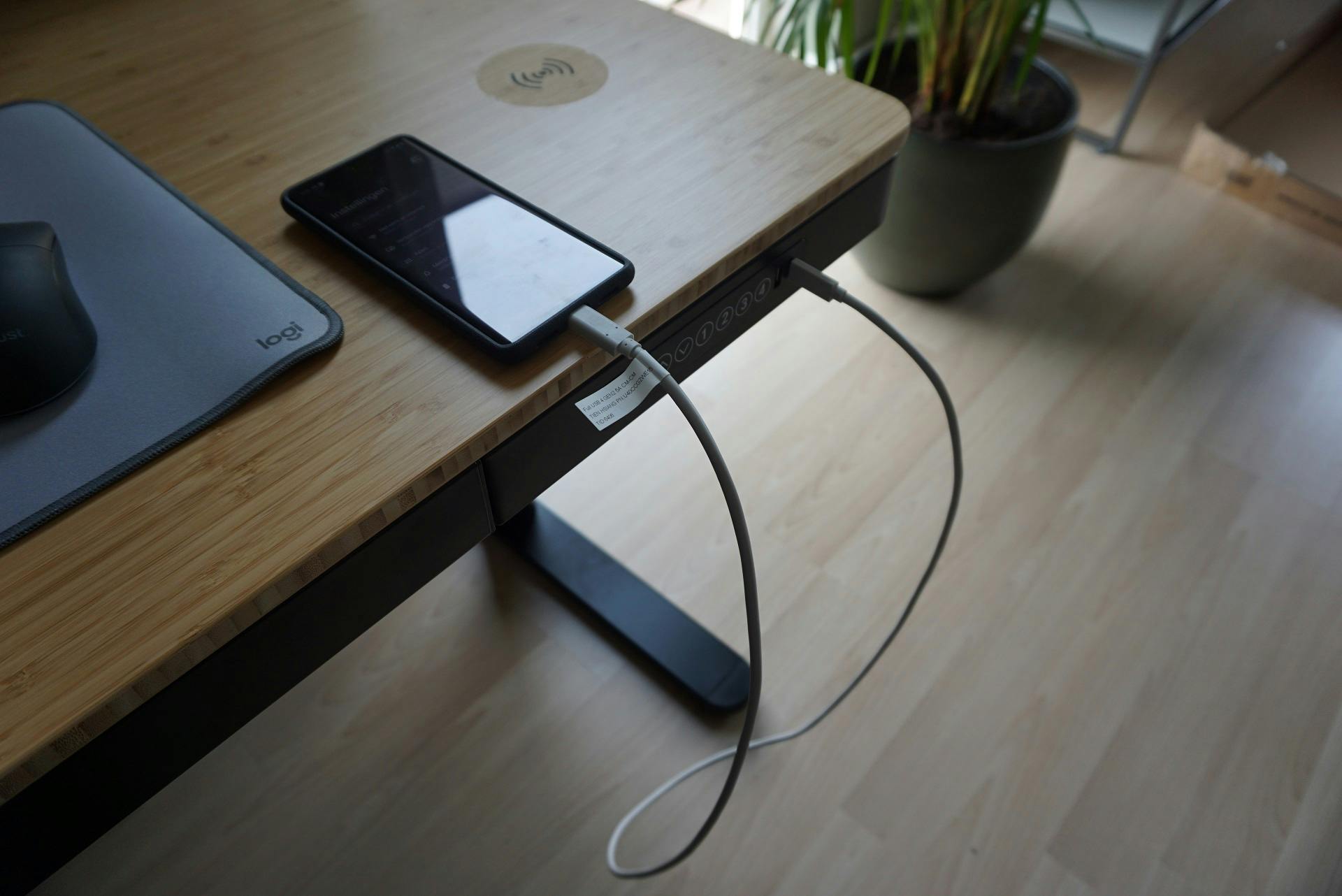 De rechterzijde van het bureaublad bevat een draadloze oplader. Een interessante functie, en zeldzaam ook in een zit-stabureau. Toch is het idee eigenlijk heel simpel: aan de onderkant van het bureaublad is een draadloze oplader gemonteerd en die geeft zijn energie af door het bureaublad. Leg je een geschikte smartphone of andere gadget op de juiste plek op het blad, dan laadt de accu op. Een plastic sticker op het blad maakt duidelijk waar je je toestel moet neerleggen. Ik vind de sticker er goedkoop uitzien, maar wilde dat voor lief nemen gezien de handige functie. Helaas werkt de draadloze oplader niet betrouwbaar. Tijdens het opladen van een smartphone wordt de lader namelijk al snel warm, waardoor mijn toestel op een gegeven moment stopt met laden om oververhitting te voorkomen. Een pijnpunt dat ik ook in andere reviews teruglees. Ik heb de sticker daarom na een paar dagen verwijderd (dat gaat eenvoudig) en de draadloze oplaadfunctie niet meer gebruikt. Jammer, en hopelijk een punt dat Flexispot verbetert in een volgend luxe bureau.