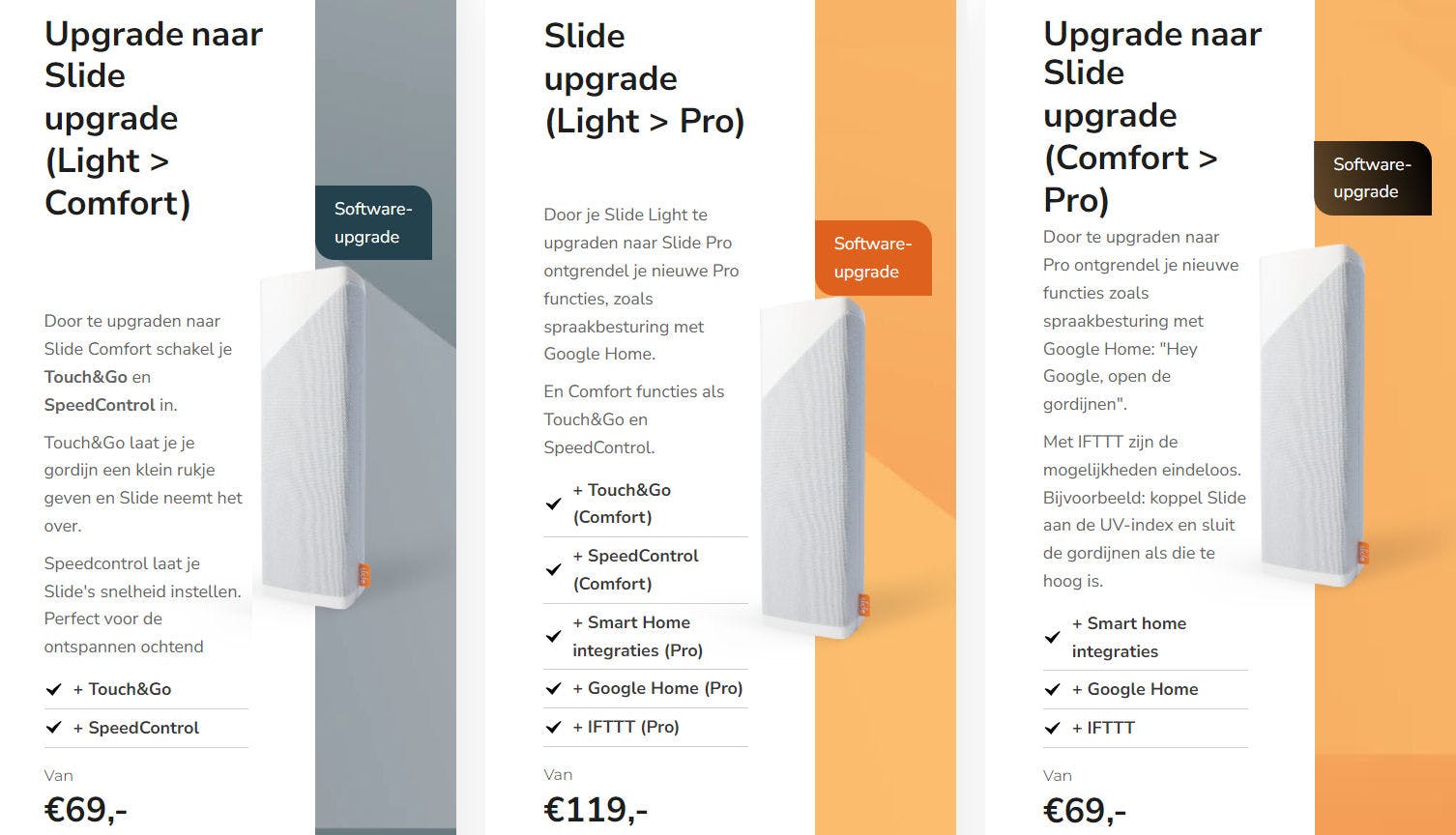 Heb je een goedkopere Slide (de Light of Comfort) gekocht, dan is het mogelijk om te upgraden naar een hogere versie. Je koopt dan in feite een upgrade van de functionaliteit van de app en je account, dat bepaalt namelijk wat je wel en niet kunt. De upgradeprijzen zijn echter niet evenredig aan de bedragen die je betaalt als je meteen een duurdere uitvoering met meer mogelijkheden aanschaft. Zo kost de upgrade van Light naar Comfort of van Comfort naar Pro 69 euro. Wil je in één keer van Light naar Pro, dan betaal je 119 euro. Het prijsverschil tussen de 'losse' Slide Light en Slide Comfort is echter 50 euro en tussen de Light en Pro is het verschil 100 euro. Als upgrader ben je dus onevenredig meer kwijt, terwijl je al aardig in de buidel hebt getast voor de Slide.