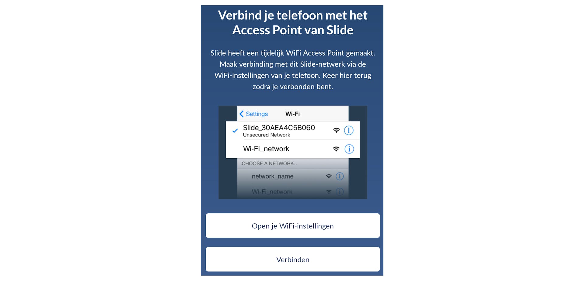 Na afloop van de handleiding is de volgende stap het kalibreren van het systeem. Om vanaf de app verbinding te maken met de Slide moet je je smartphone via wifi direct verbinden met de Slide, die op dat moment fungeert als accesspoint.