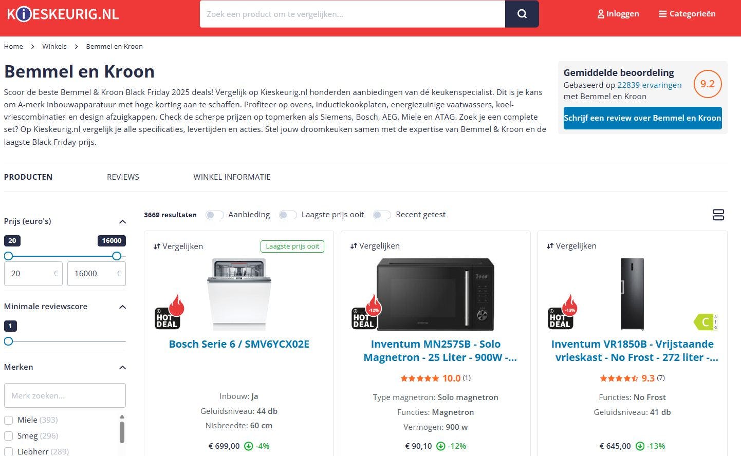 Op Kieskeurig.nl staat het volledige aanbod van Bemmel & Kroon overzichtelijk bij elkaar. De winkelpagina toont actuele modellen, acties en specificaties, zodat je in één oogopslag ziet welke apparaten passen bij jouw wensen en meteen kunt vergelijken.