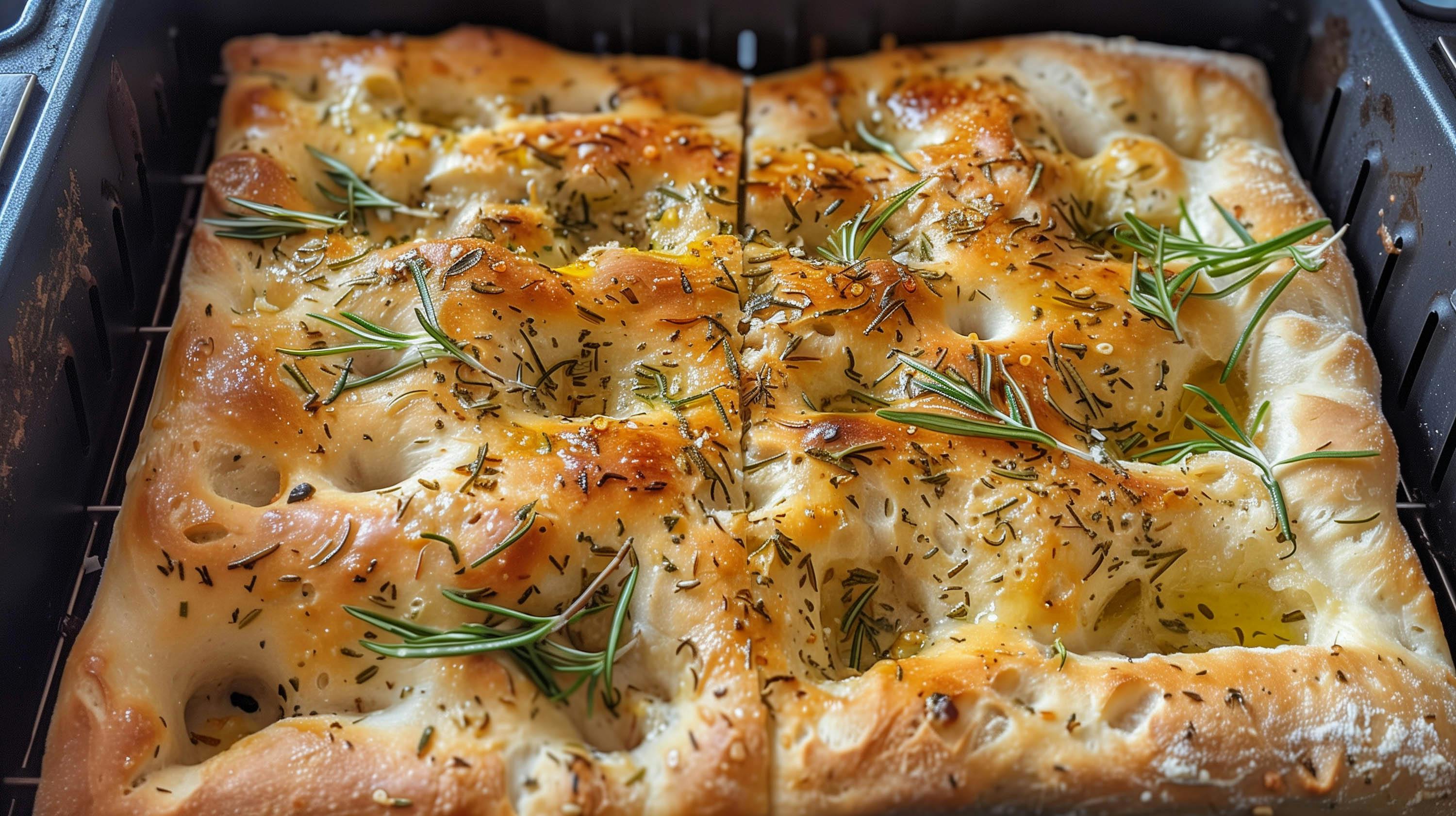 Instructies: * Meng de bloem, gist, zout en suiker in een kom. Voeg het water en de olijfolie toe en kneed tot een soepel deeg. * Laat het deeg afgedekt op een warme plaats rijzen gedurende 30 minuten. * Rol het deeg uit tot een rechthoek die in je airfryer past. Maak met je vingers kuiltjes in het deeg en bestrooi het geheel met kruiden. * Bak de focaccia in de voorverwarmde airfryer op 180°C gedurende 12-15 minuten goudbruin. * Varieer met verschillende kruiden en toppings zoals olijven, zongedroogde tomaten of Parmezaanse kaas voor een unieke smaakbeleving.