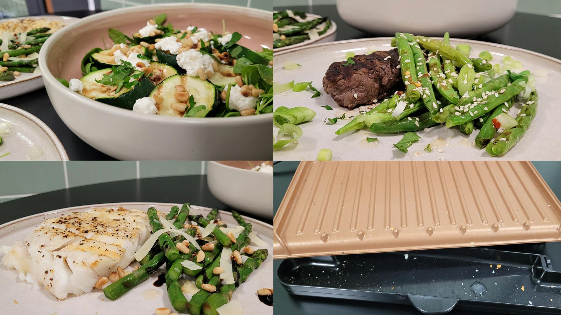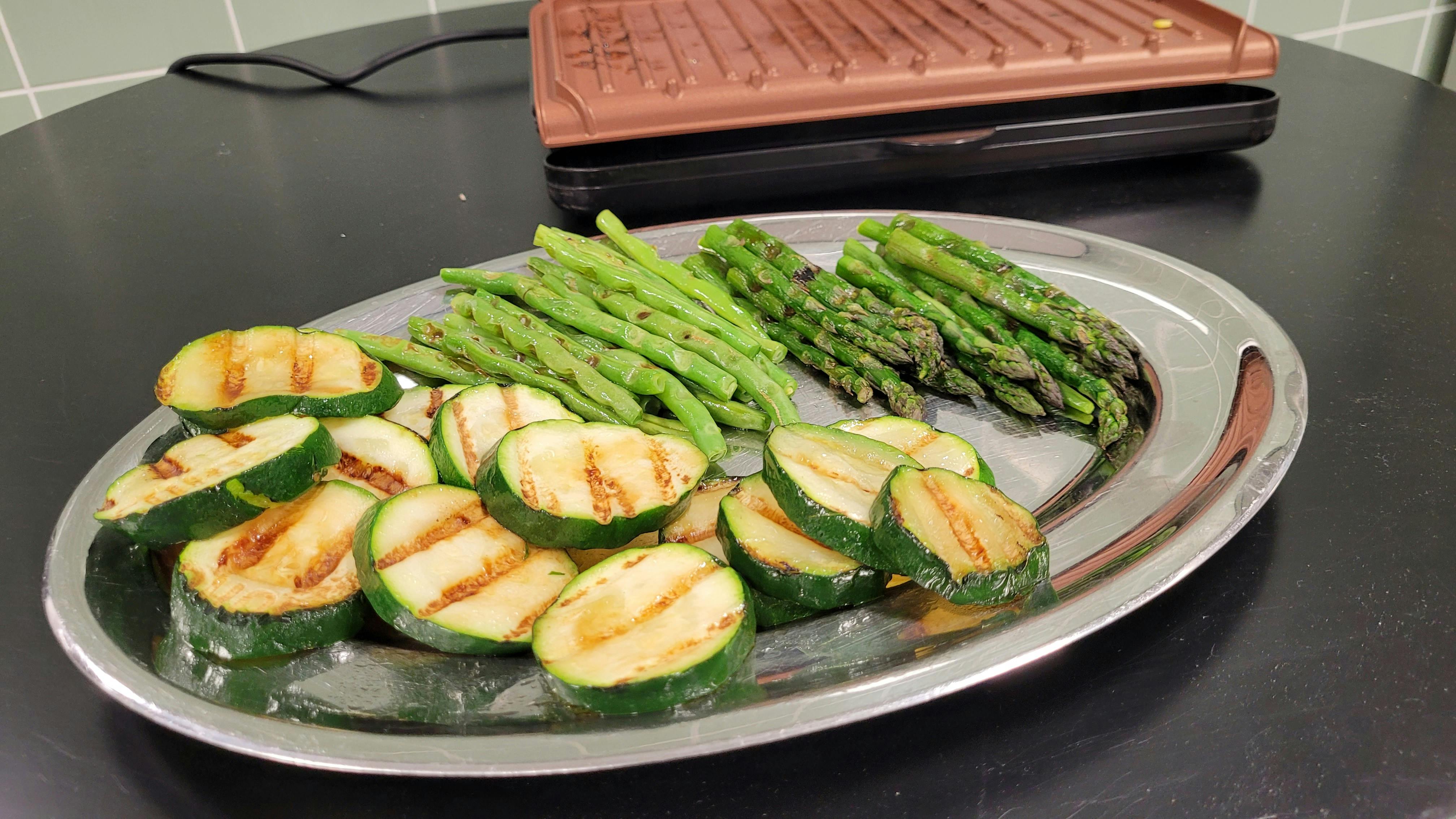 Bij de groenten lag de verwachting hoog: dat lijkt niet zo moeilijk om te bereiden. Ondanks het hoogteverschil in groenten (lees: de plakjes courgette waren iets dikker dan de boontjes en de groene asperges), kwamen uiteindelijk alle groenten er mooi gegrild uit. Wil je het liefst in alle groenten echt die duidelijke grillstructuur zien, dan raden we aan per groente apart te grillen.