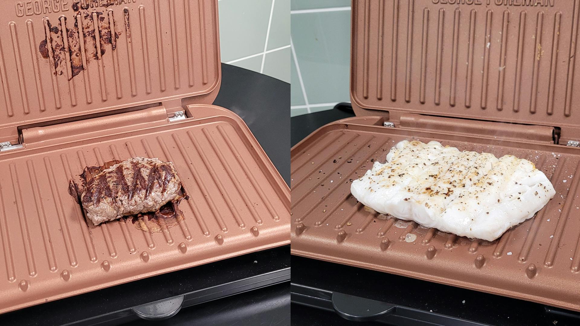 Omdat kabeljauw van zichzelf een vrij losse structuur heeft, was de verwachting dat ons visje snel uit elkaar zou vallen op de grillplaat. Maar in beide gevallen – ook bij de biefstuk – bleef de boel niet aan de platen plakken; dat is te danken aan de anti-aanbaklaag. Op het eerste oog ziet het eten er dus goed uit!