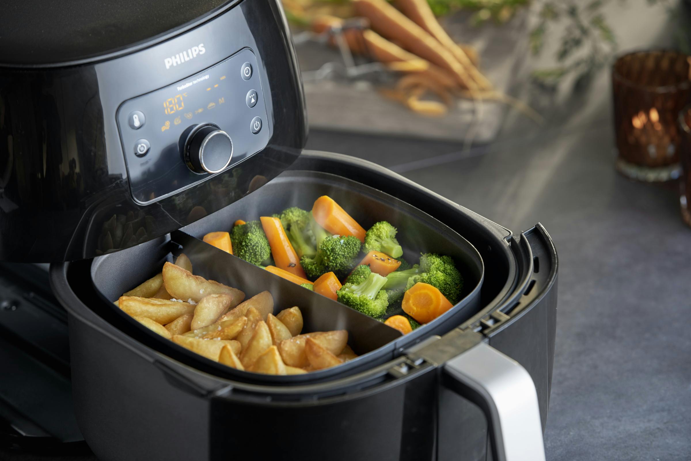 Een panverdeler is ideaal als je meerdere ingrediënten wilt garen, maar niet wilt dat ze elkaars smaak overnemen. Zo kun je met de panverdeler aan de ene kant je groente bereiden en aan de andere kant aardappeltjes bakken. Een andere optie is een kookrek voor de airfryer. Hiermee creëer je een extra verdieping, waardoor je bijvoorbeeld meerdere burgers tegelijkertijd bakt. Of gebruik het rek om een hele maaltijd in één keer te maken. Leg dan eerst de aardappelpartjes in de pan en de groente en het vlees op het kookrek erboven.