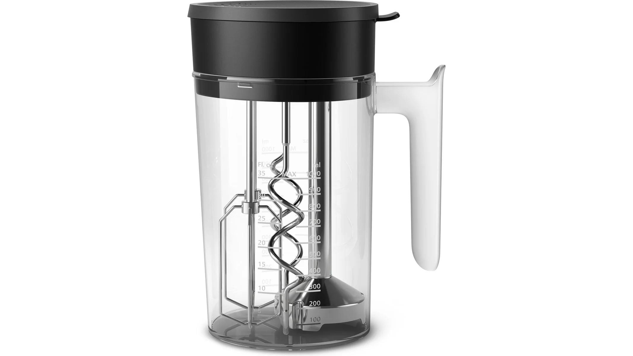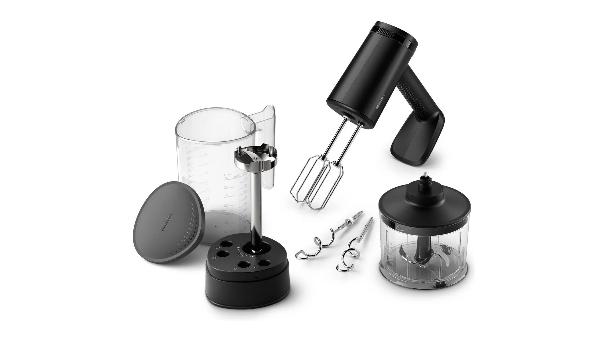 Wat de set echt compleet maakt, zijn de meegeleverde accessoires: naast gardes en deeghaken krijg je ook een staafmixer-opzetstuk, een hakmolen én een maatbeker met slimme opbergfunctie. Alles past netjes in elkaar en is makkelijk op te bergen.