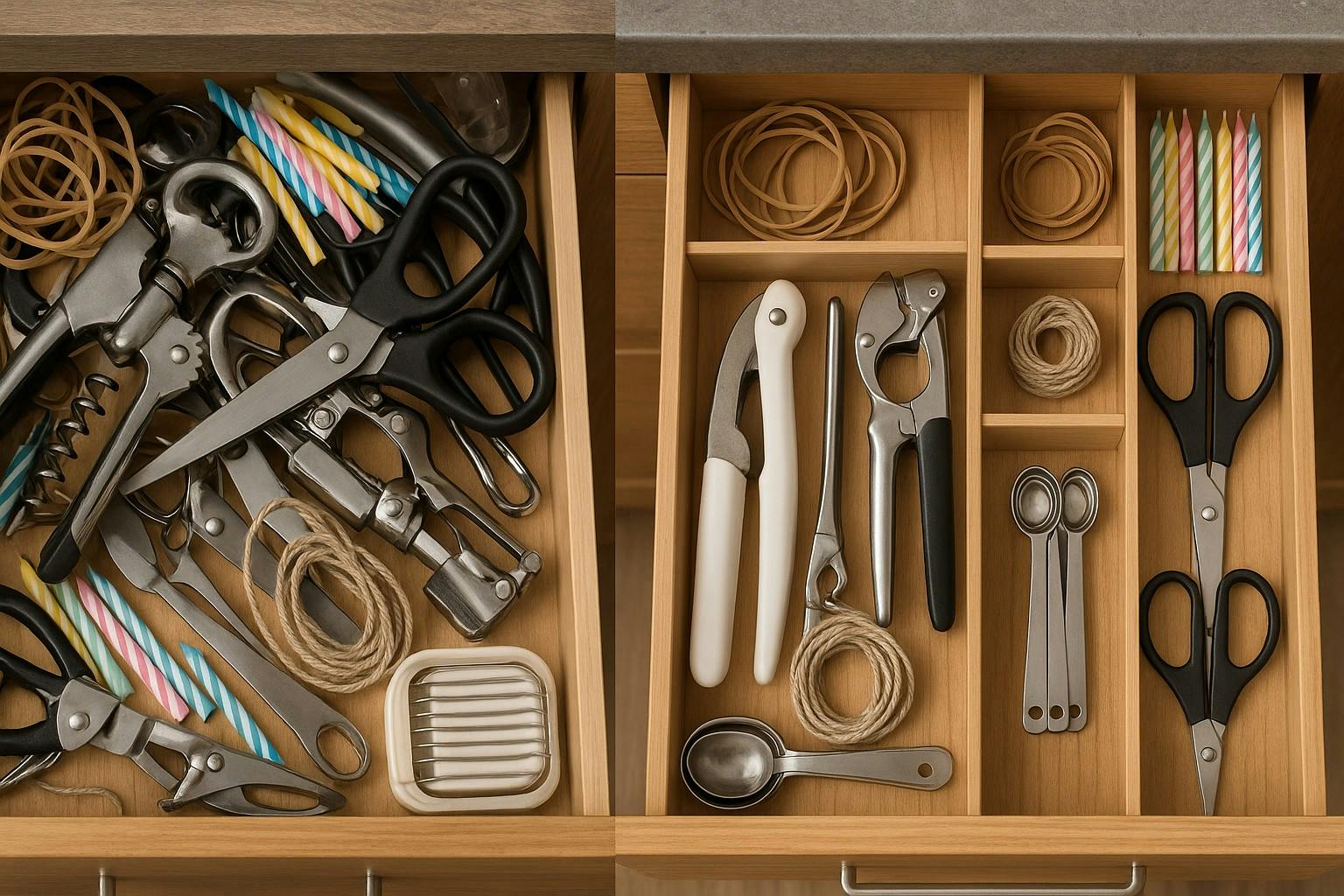 De beruchte rommella kan prima blijven, zolang je maar weet wat erin ligt. Haal alles eruit, maak de lade schoon en bekijk alle spullen nauwkeurig. Ook hier geldt: eerst opruimen. Die half opgebrande kaarsjes voor op een verjaardagstaart, heb je die echt nodig? Vier bijna lege doosjes lucifers, kun je daar niet één vol doosje van maken? En wat moet je eigenlijk met drie kurkentrekkers en vier flesopeners?