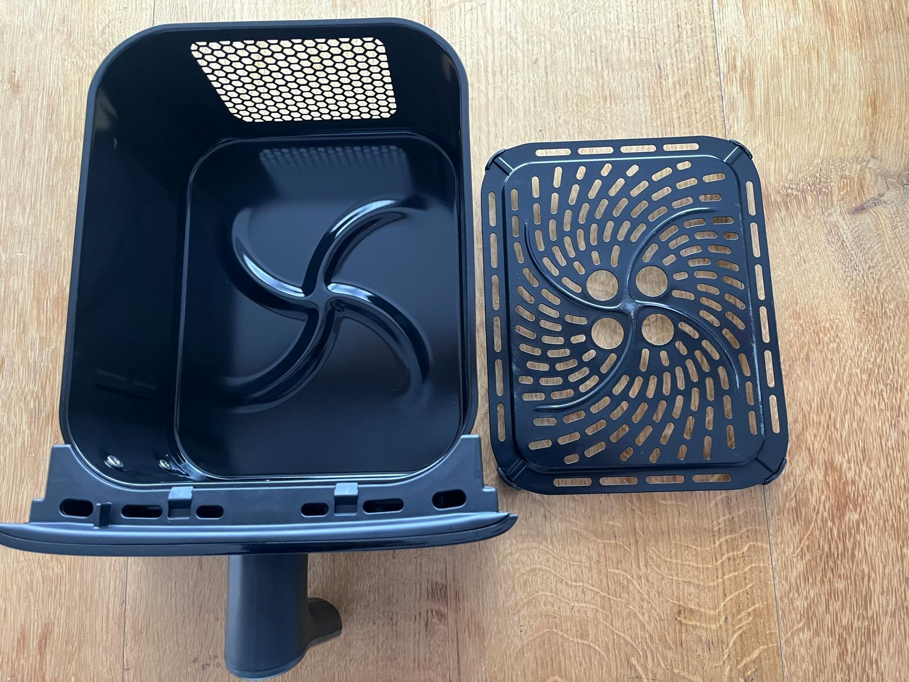 Wat daarnaast ook wat onhandig is: kleinere stukjes eten, zoals broccoliroosjes of dunne frietjes, vallen door de gaten op de bodem en blijven onder het rooster liggen. Die krijg je er eigenlijk niet meer uit zonder het rooster te verwijderen. Dat doe je door het op te tillen via het grotere gat middenin, en dat is niet aan te raden als het rooster nog heet is.