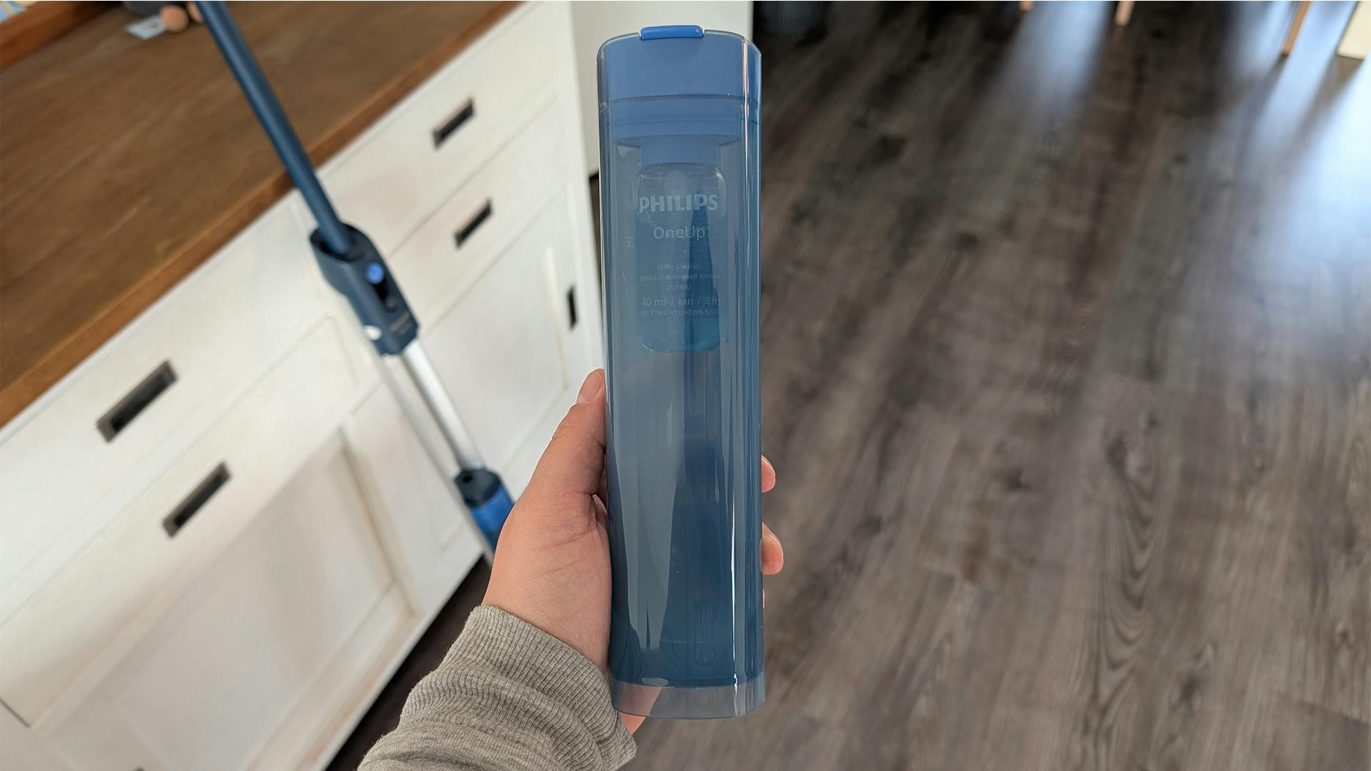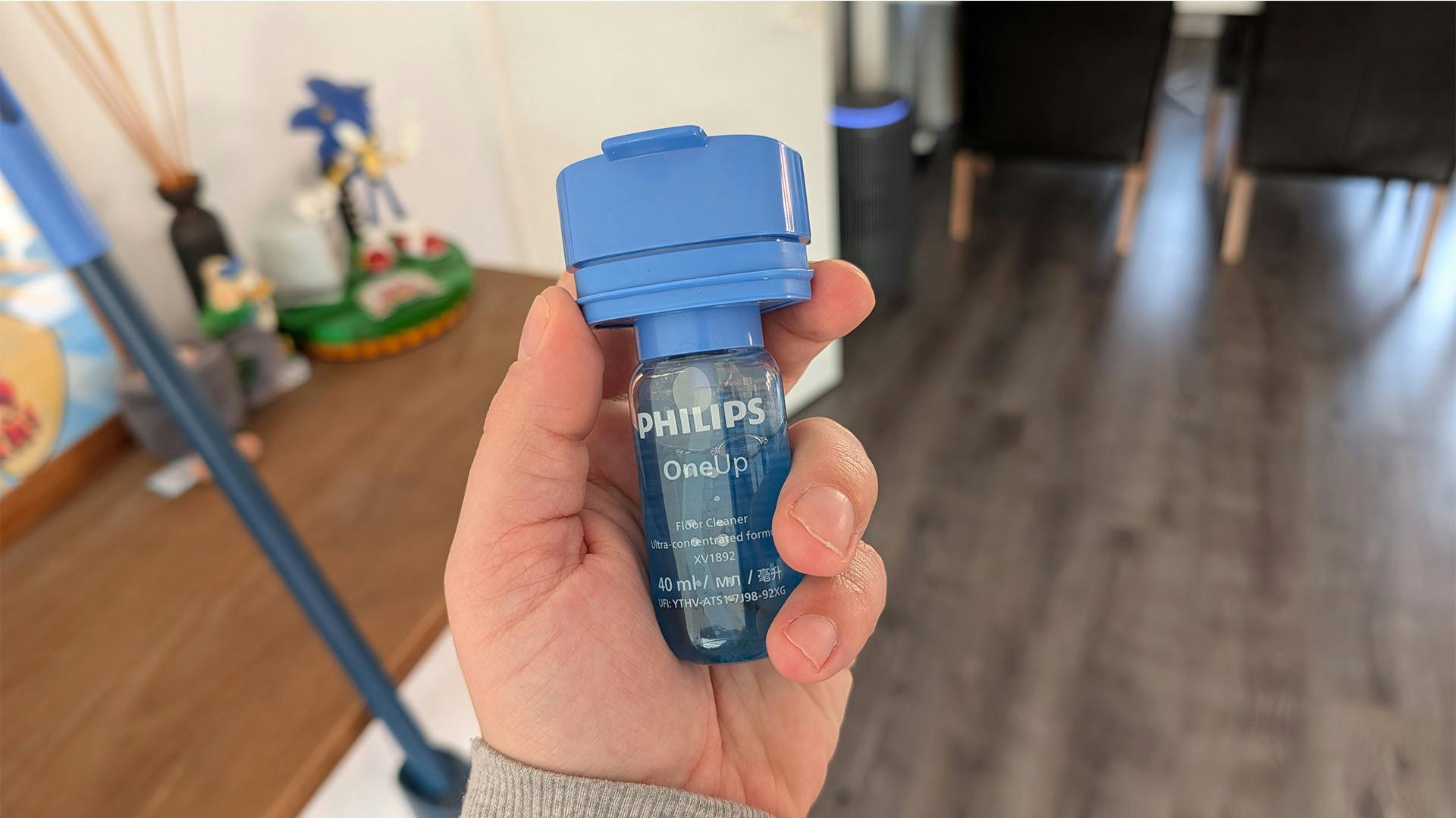Philips raadt natuurlijk aan om het speciaal voor dit systeem ontwikkelde schoonmaakmiddel te gebruiken. Twee flesjes kosten 20 euro en zijn volgens de fabrikant goed voor evenveel sessies als drie flessen gewone vloerreiniger. Per schoonmaakbeurt druk je één keer op de knop om het schoonwaterreservoir van de juiste hoeveelheid zeep te voorzien, zodat je altijd de optimale verhouding hebt. Toch vragen we ons af of je echt aan die Philips-flesjes vastzit. In de praktijk werkt het systeem ook prima met je eigen schoonmaakmiddel.