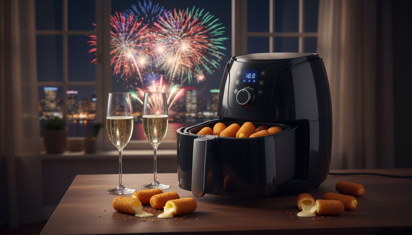 Ook voor oudejaarsavond is de airfryer een uitkomst. Mini-kaaskroketjes worden er precies goed in: knapperig van buiten en romig van binnen. Je kunt een kant-en-klare diepvriesvariant gebruiken, maar zelf maken kan ook. Dat kost wel wat meer tijd. Begin een dag van tevoren. Maak een dikke kaassaus door boter te smelten op matig vuur, bloem erdoor te roeren en geleidelijk melk toe te voegen terwijl je blijft roeren. Laat de saus binden, roer er geraspte oude kaas doorheen tot die gesmolten is en breng op smaak. Laat de massa volledig afkoelen en zet minimaal 4 uur (of een nacht) in de koelkast. Rol de volgende dag kleine balletjes of rolletjes van het afgekoelde mengsel, haal ze achtereenvolgens door bloem, eigeel en paneermeel en bak ze in de airfryer op 200 graden in ongeveer 7 minuten goudbruin. Serveer ze met mosterd of een pittige dipsaus.