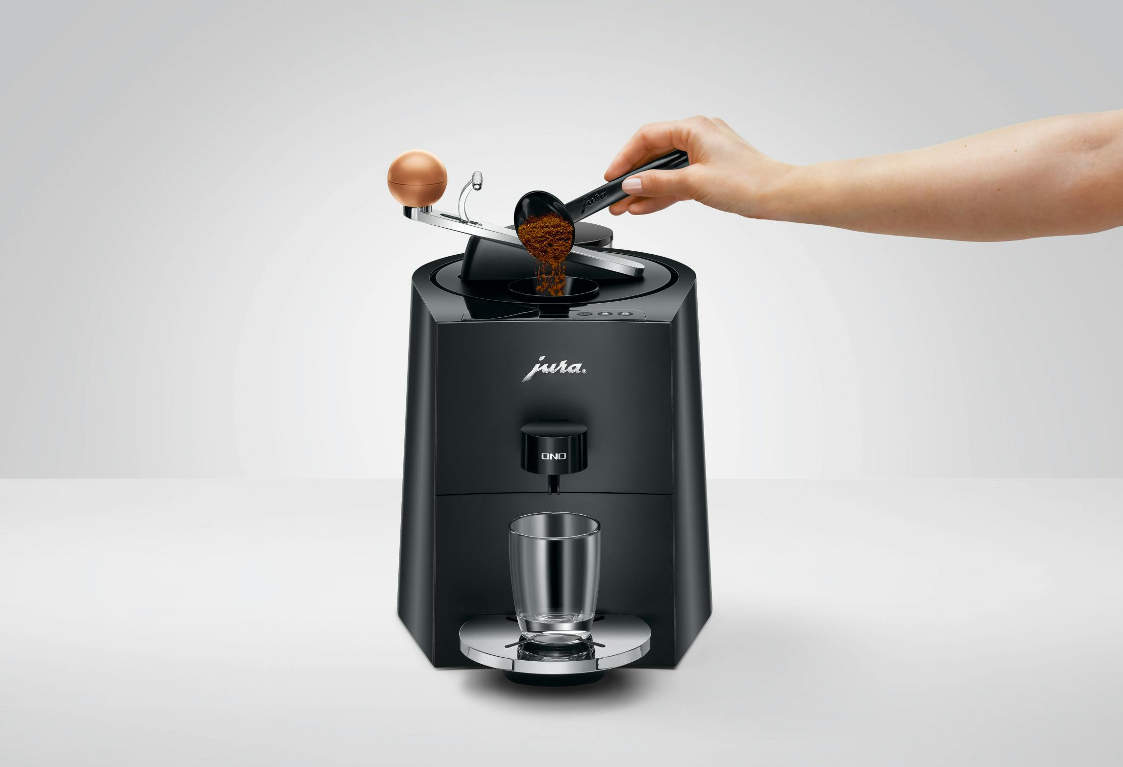 Bewust koffiegenot. De JURA ONO is een koffiemachine waarmee je bewust je kopje koffie kunt zetten. Niet alleen moet je zelf zorgen voor je gemalen koffiebonen, maar de bereiding van je kopje koffie is echt een bewust proces. Je bedient de machine met een handgreep en een hendel, waardoor je een echt baristamoment creëert.