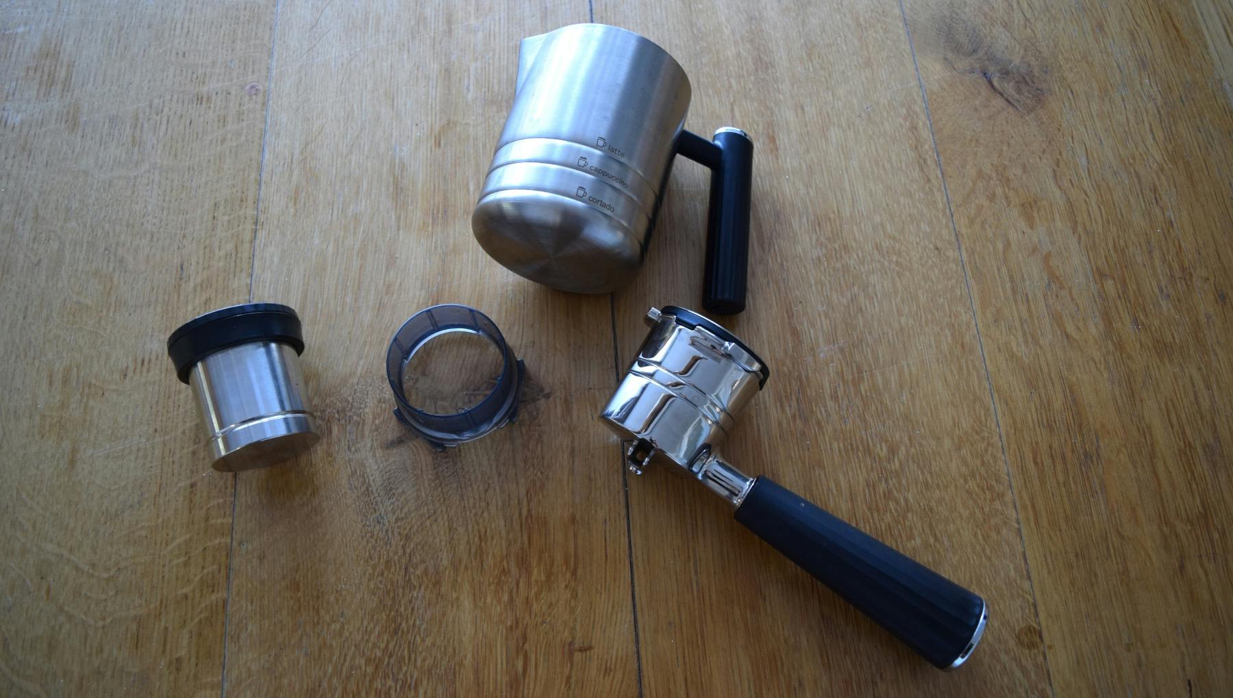 Er is een losse trechter die je gebruikt tijdens het malen van de koffie, en een stamper om de koffie in het bakje samen te drukken. Tot slot is er nog het melkkannetje.