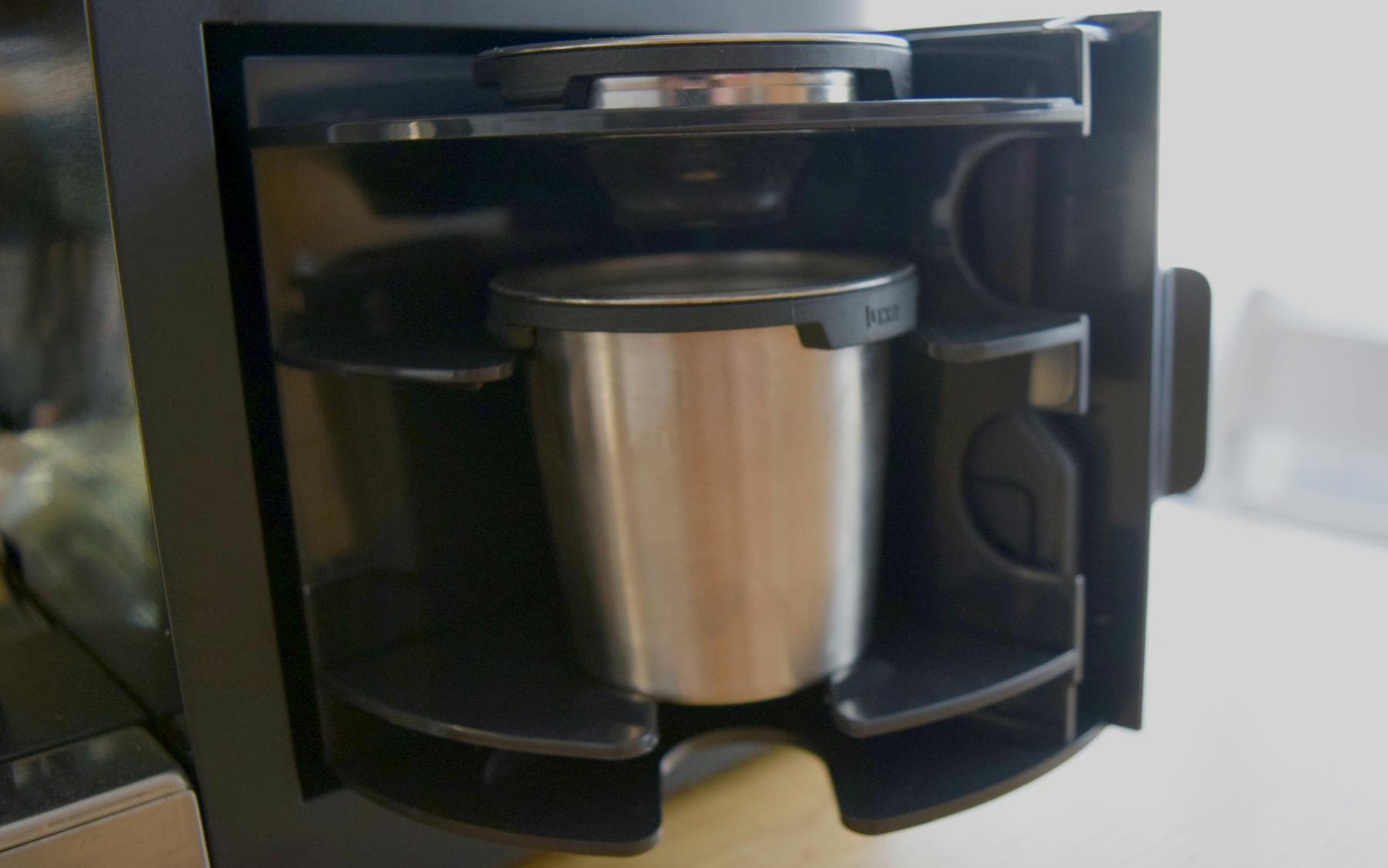 Mocht je cappuccino willen maken, dan doe je dierlijke of plantaardige melk in de melkkan tot aan de streep, kies je de gewenste dikte en laat je de melk warm worden en opschuimen tot een pieptoon aangeeft dat de melk klaar is. Je hoort het kleine mixertje onder in de kan flink tekeergaan en dat levert een prima resultaat op. Na het leeggieten van de kan start een automatisch schoonmaakprogramma.