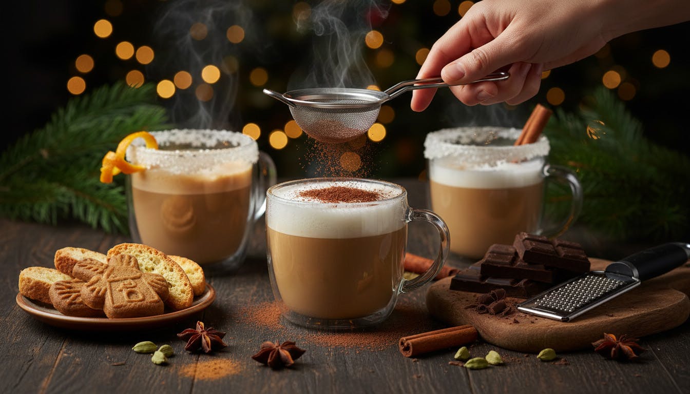 Je kunt de feestkoffie nog net wat mooier presenteren door aandacht te besteden aan de garnering. Een klein beetje kaneel, nootmuskaat of cacaopoeder op de melkschuimlaag doet bijvoorbeeld al wonderen. Gebruik een klein zeefje zodat de poeder gelijkmatig verdeeld wordt en er geen klontjes ontstaan. Voor een luxe effect kun je met een fijne rasp wat krullen van een blok pure of witte chocolade schaven. Dit smelt langzaam weg in het schuim en geeft bij elke slok een beetje extra textuur.