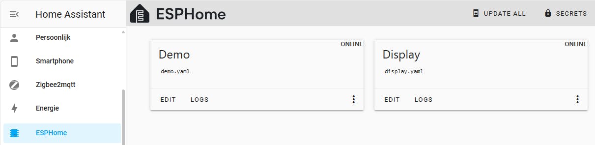 Het dashboard van ESPHome toont alle toegevoegde apparaten.