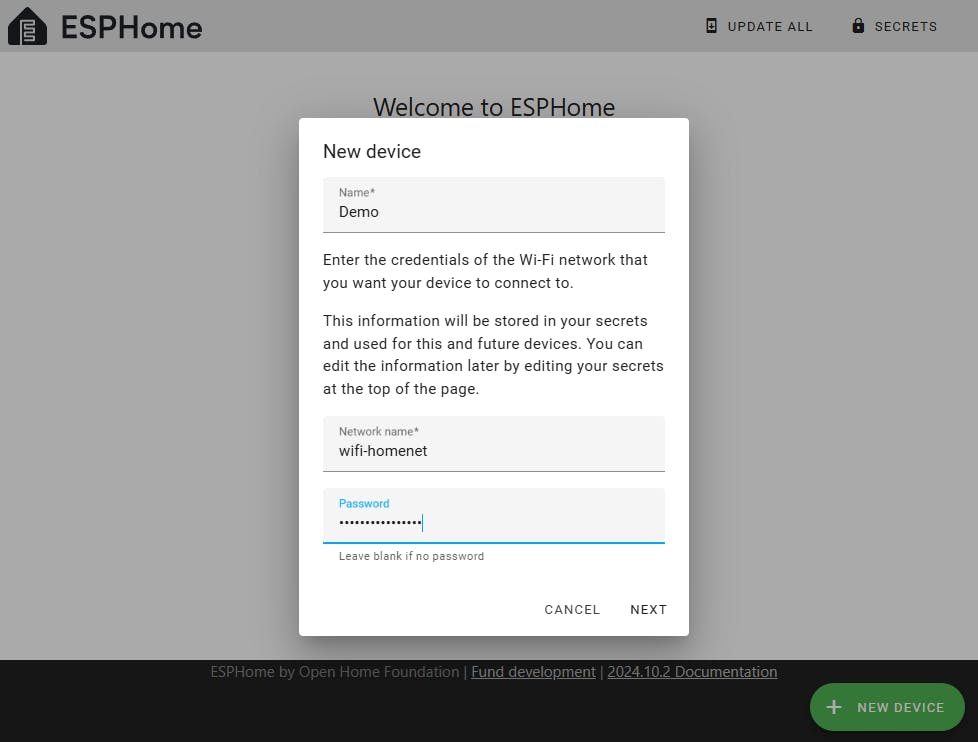 Klik binnen ESPHome op New device om een nieuwe microcontroller te initialiseren. Vul bij Name een naam in voor het apparaat. Bij Network name vul je de naam (SSID) in van het wifi-netwerk waarmee de microcontroller moet verbinden en bij Password het bijbehorende wachtwoord. Klik dan op Next.