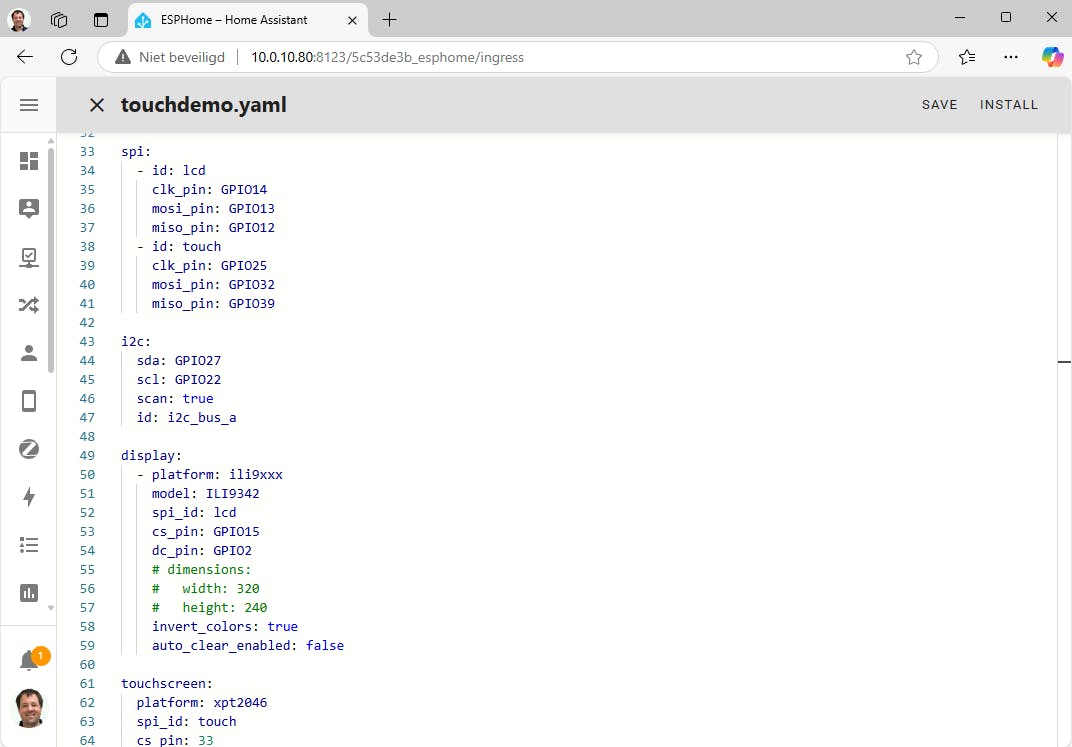 Na het toevoegen van je touchscreen heb je direct een basisconfiguratie voor ESPHome. Via Edit kun je deze configuratie aanpassen. Zowel voor het aansturen van het display als de registratie van het aanraken wordt SPI (Serial Peripheral Interface) gebruikt. Voor onze ESP32-2432S028 is dit de configuratie, rekening houdend met de gebruikte interne GPIO-pinnen: