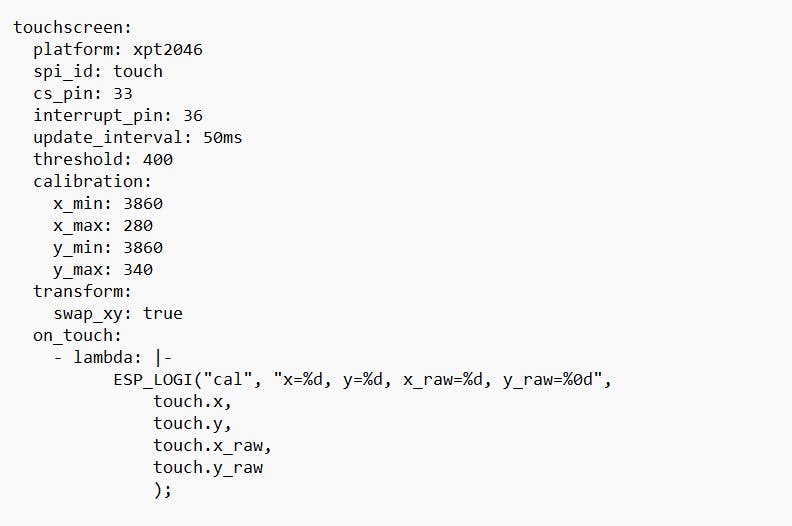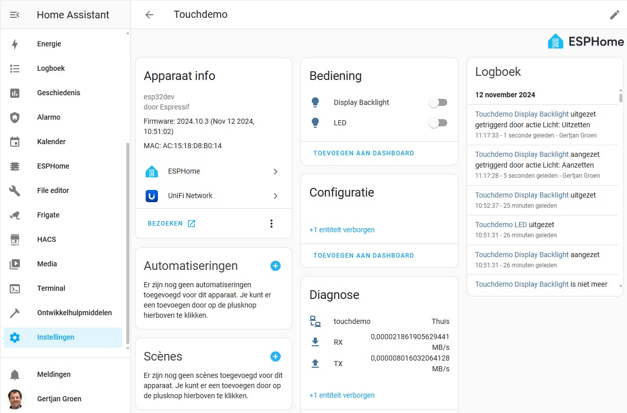 Bediening via het scherm is nog niet mogelijk. Daarvoor moeten we het touchscreen toevoegen aan de configuratie van ESPHome: