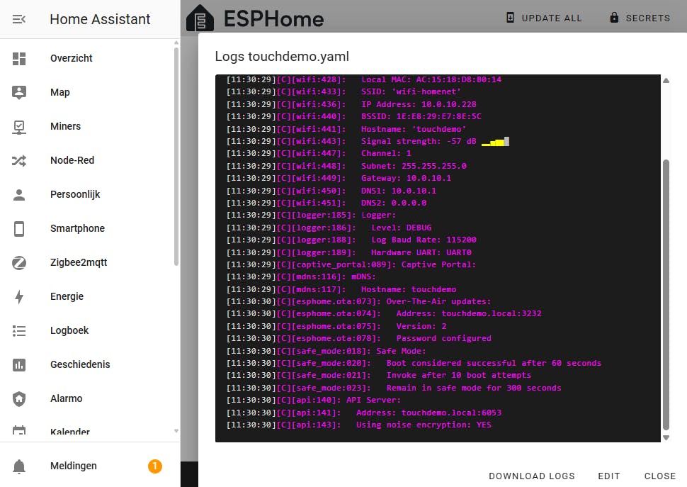 Bewaar de aanpassingen en installeer de nieuwe firmware. Controleer of je de demo goed kunt bedienen. De regels onder on_touch zorgen dat in de logs de geregistreerde coördinaten worden getoond. Er kunnen aanpassingen nodig zijn in de regels onder calibration en transform.