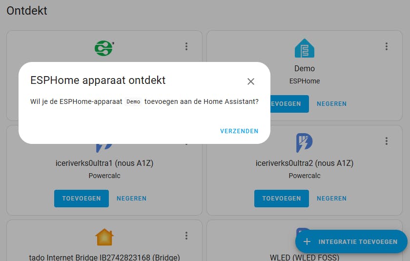 Het apparaat met ESPHome moet je nog toevoegen aan Home Assistant.