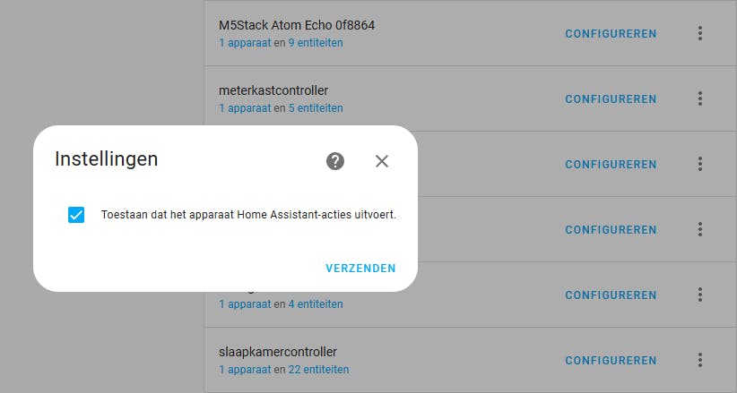 Ga naar Instellingen / Apparaten en klik dan onder het kopje Geconfigureerd op ESPhome. Achter het bewuste apparaat klik je vervolgens op Configureren. Zet een vinkje bij Toestaan dat het apparaat Home Assistant-acties uitvoert. Klik op Verzenden. Hierna zijn alle acties zoals het omschakelen van de lamp en regelen van de helderheid wel toegestaan.