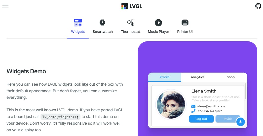LVGL wordt gebruikt in slimme apparaten zoals thermostaten, smartwatches en keukenapparatuur, en zelfs in touchscreens voor industriële omgevingen. Op de website vind je enkele interactieve demo’s voor bekende toepassingen, waarbij de gebruikersinterface in de browser wordt getoond.