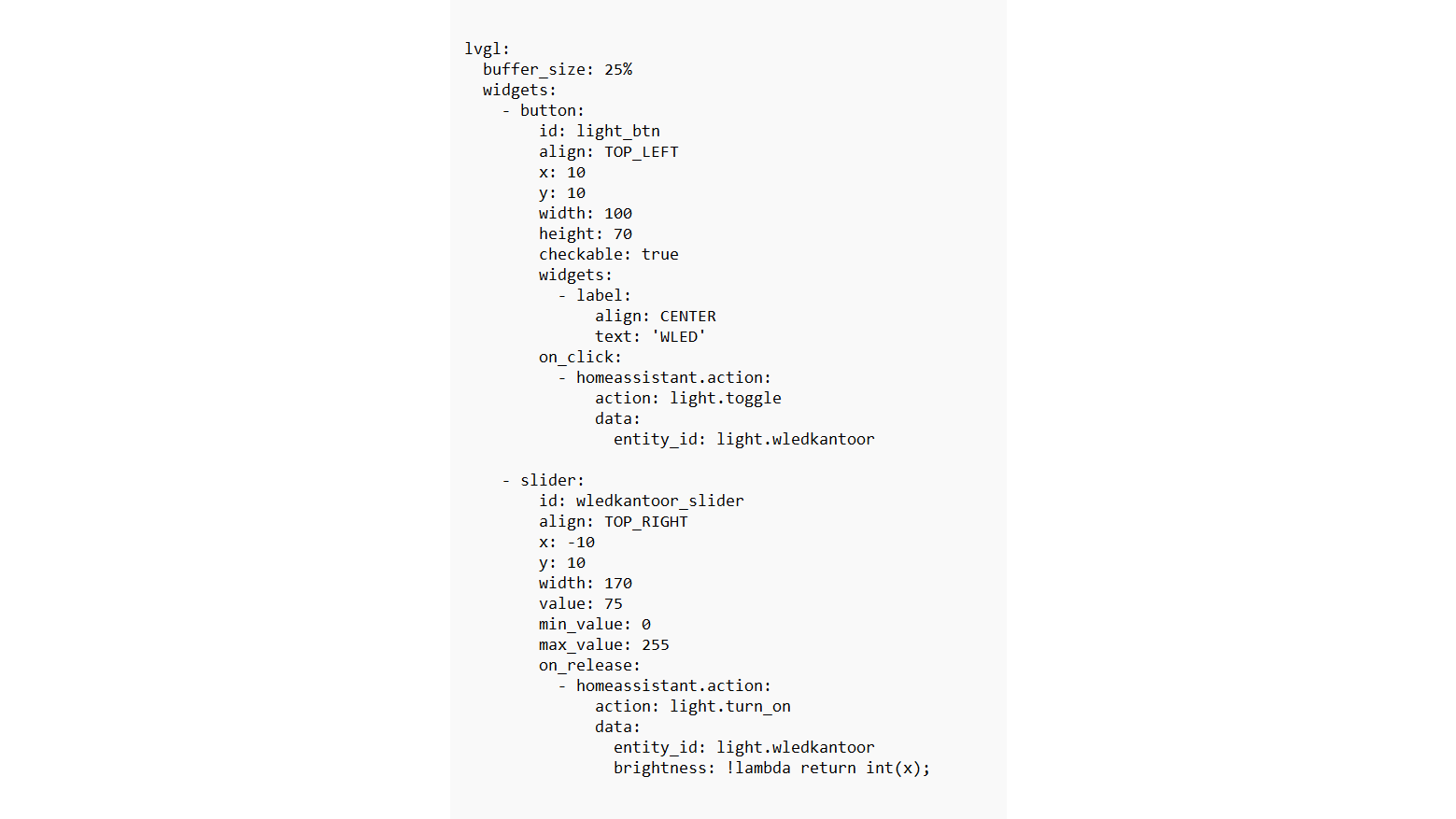Onder de regel lvgl kun je nu de gewenste LVGL-componenten toevoegen aan je YAML-configuratie. Denk aan bijvoorbeeld knoppen, schuifregelaars, grafieken of labels. In dit voorbeeld voegen we aan de bovenkant alleen twee widgets toe voor een dimbare led, te weten een schakelaar (button) en schuifregelaar (slider).