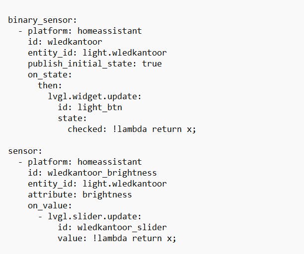 De entiteit voor de dimbare lamp heeft in Home Assistant de naam light.wledkantoor. De waardes zijn nodig om de widgets de juiste status te kunnen geven. Daarom voegen we hieronder een binary_sensor toe voor de status (aan of uit) en een sensor voor het helderheidsniveau. We werken vervolgens bij on_state en on_value de widgets bij als de status verandert in Home Assistant. Bij id vul je uiteraard de id van de betreffende widget in.