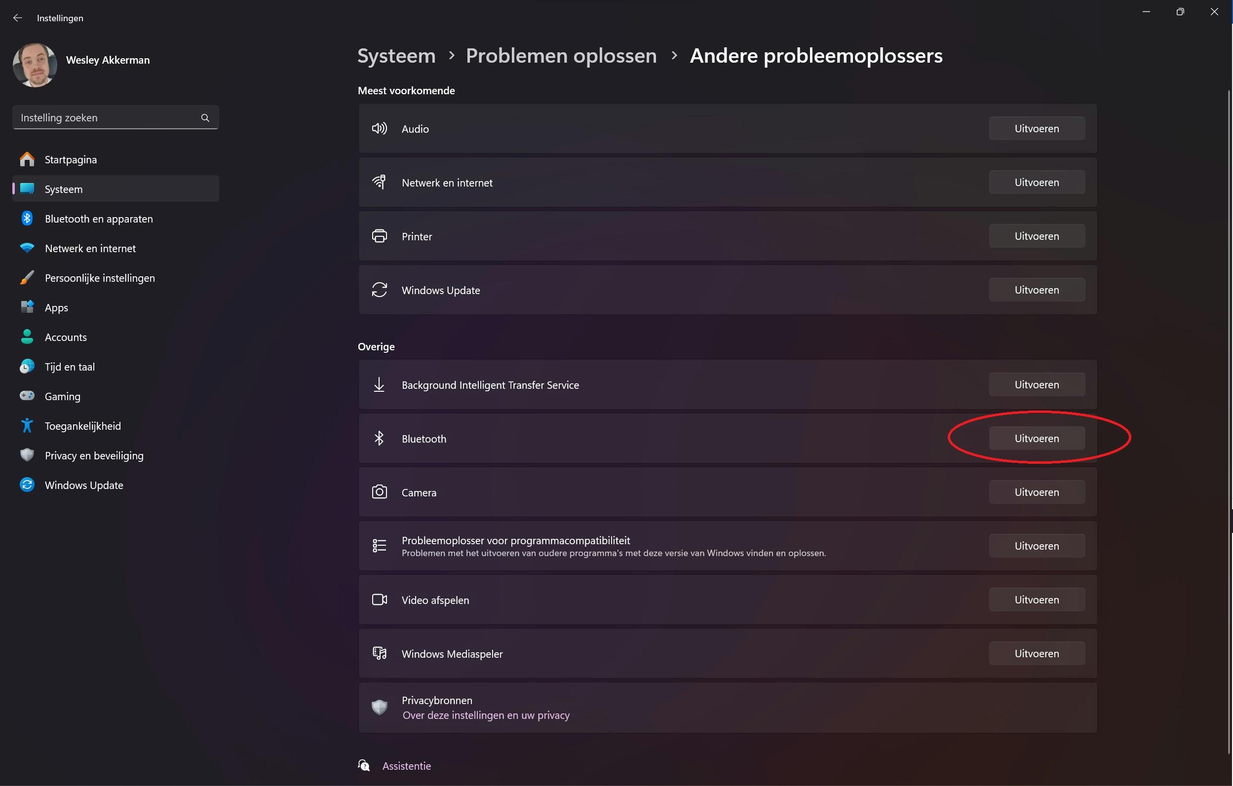 Als je dit allemaal geprobeerd hebt en je inmiddels nog maar één bluetooth-apparaat aan Windows gekoppeld hebt, dan kun je nog even de probleemoplosser proberen. Die bereik je door naar Instellingen > Systeem > Problemen oplossen te gaan. Daar zie je Andere probleemoplossers staan. Klik daarop en druk naast Bluetooth op Uitvoeren. Volg vervolgens de stappen uit die in beeld verschijnen. Mogelijk is het probleem daarmee verholpen.