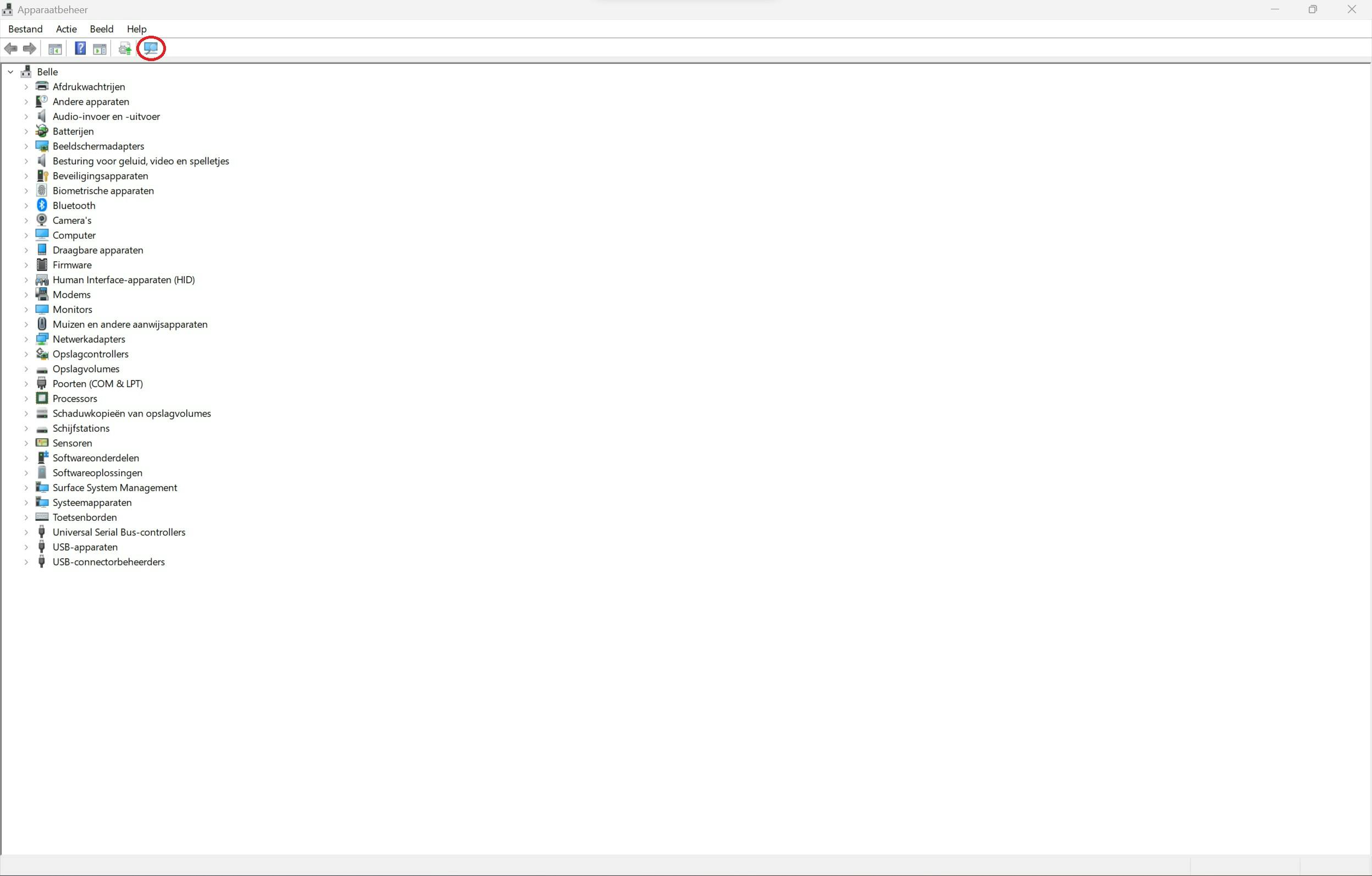 Binnen het venster Apparaatbeheer ga je naar het knopje rechts op de balk onder het menu. Dat is een beeldscherm met een vergrootglas ervoor. Als je met je muis boven de knop hangt, komt de tekst 'Zoeken naar gewijzigde apparaten' in beeld. Als je daar op klikt, is het systeem wellicht 2 seconden bezig om de lijst te verversen. Het zou kunnen zijn dat verdwenen apparaten op deze manier weer in de lijst verschijnen. Zo niet, dan gaan we een stapje verder.