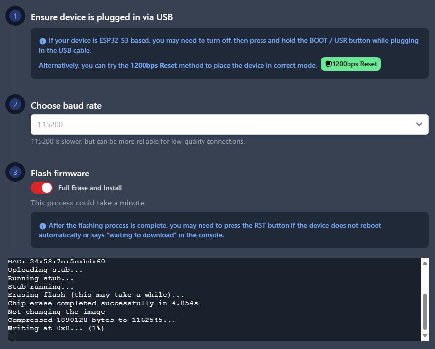 Klik hierna op Flash. Zet een vinkje bij Full Erase and Install. Klik dan op Erase Flash and Install. Selecteer de seriële poort waarop het apparaat is aangesloten en klik op Connect. Na enkele minuten staat de firmware op het apparaat. Je kunt dit volgen via het venster. Er zijn meestal geen extra handelingen nodig.