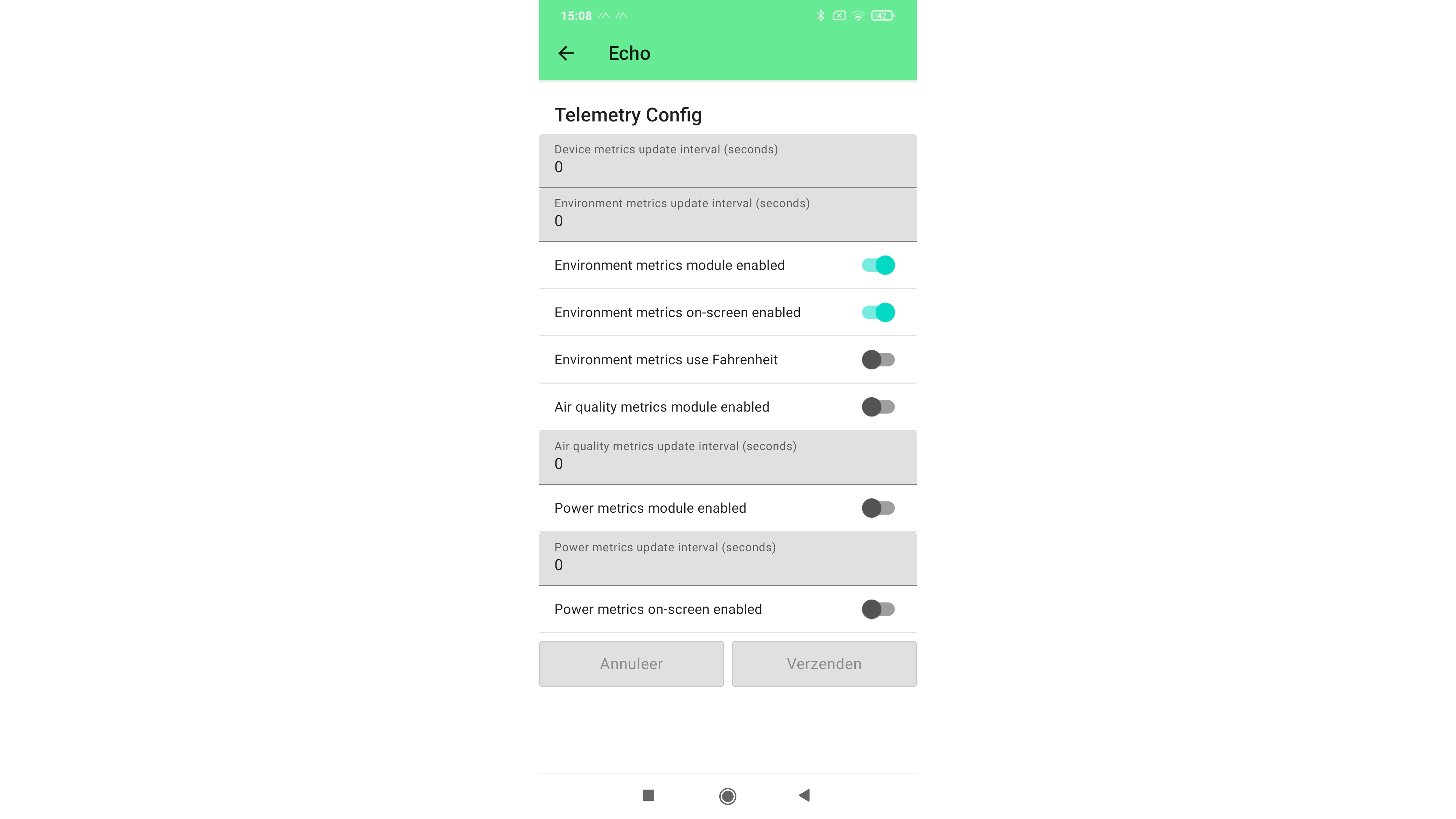 Binnen Meshtastic kun je ook gebruikmaken van telemetrie. Daarvoor nemen we de LilyGo T-Echo met BME280-sensor als voorbeeld. Hiermee kun je de temperatuur, luchtvochtigheid en luchtdruk registreren en doorgeven. Voor deze opties ga je weer naar Radio configuratie. Kies dan onder het kopje Module configuratie de optie Telemetry. Zet een vinkje bij Environment metrics module enabled. Daarmee komen deze meetgegevens beschikbaar voor de node. Zet optioneel een vinkje bij Environment metrics on-screen enabled. Daarmee zie je meetwaardes ook op het kleine schermpje van het apparaat. Klik daarna op Verzenden. In het overzicht met nodes zullen de meetwaardes bij deze node zichtbaar zijn.