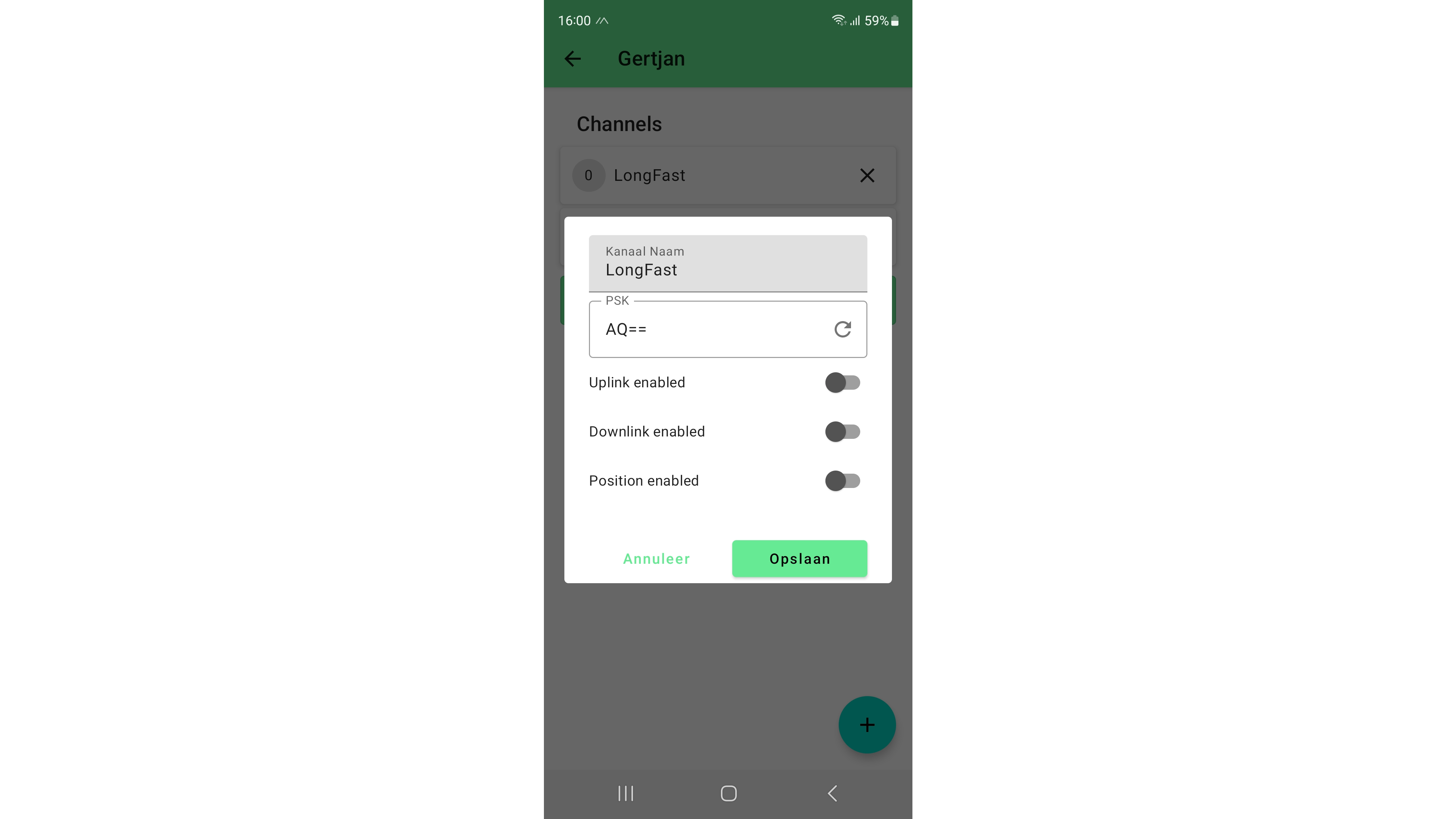 Hiertoe ga je in de Meshtastic-app naar Radio configuratie. Kies Channels en voeg als eerste een nieuw publiek kanaal toe. Klik daarvoor op het plusteken en accepteer de standaardwaardes zoals de naam (LongFast) en encryptiesleutel (in het veld PSK). Kies Opslaan.