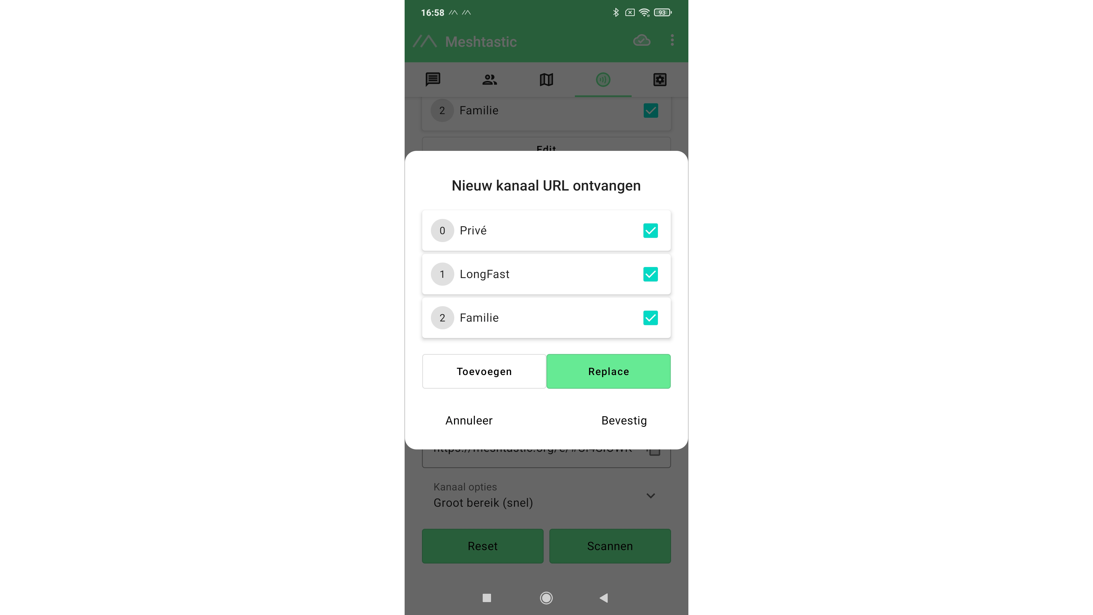 Nu kun je de QR-code scannen. Kies Replace om de huidige kanalen te vervangen door de nieuwe en klik op Bevestig. Hierna zal de radioconfiguratie overigens worden aangepast en zal het apparaat herstarten. Je gps-positie is door de gemaakte aanpassingen alleen beschikbaar voor mensen die toegang tot het primaire kanaal hebben dat we Privé hebben genoemd.