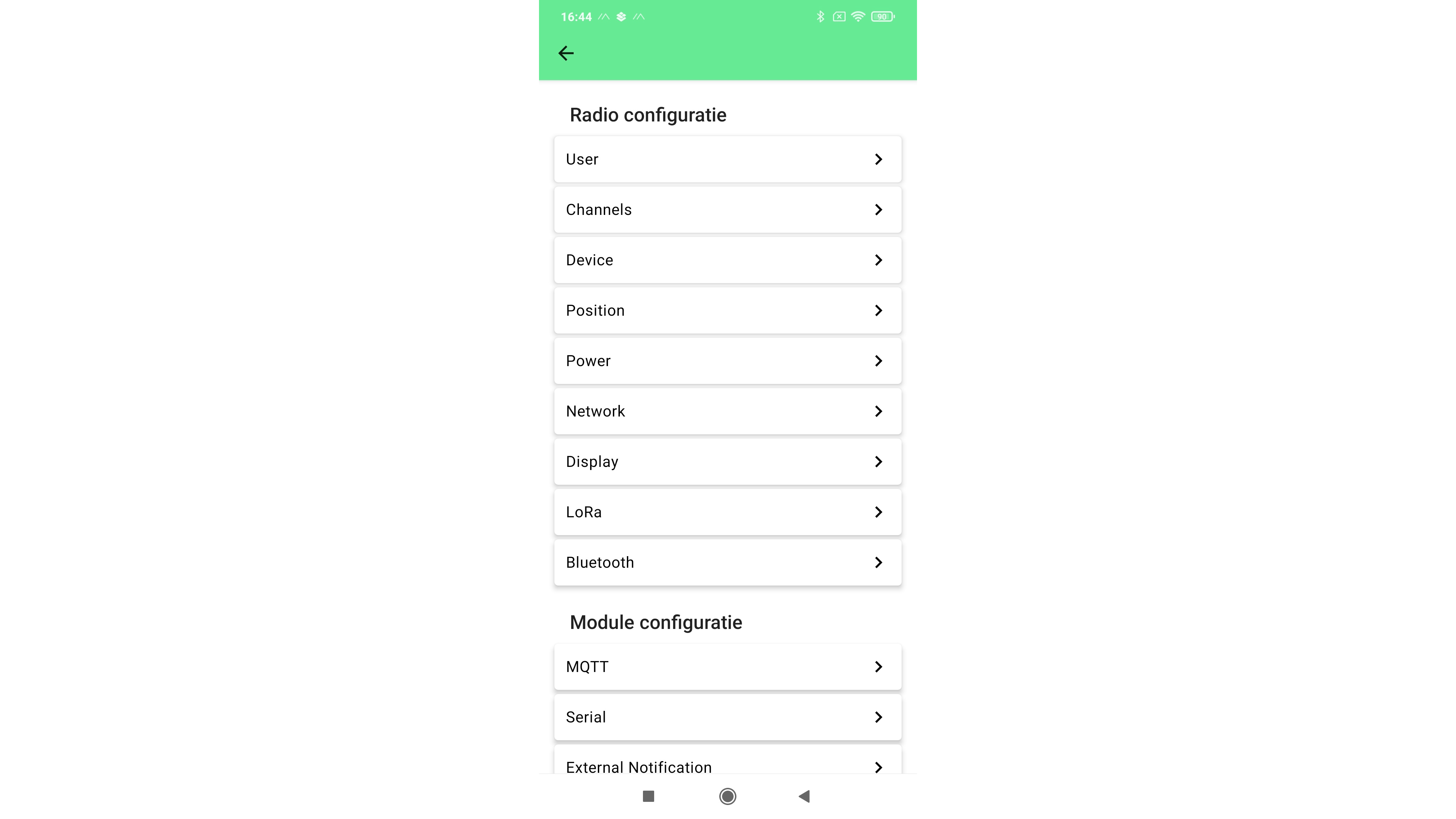 Je kunt de app overigens met verschillende Meshtastic-apparaten gebruiken, handig als je er meerdere gaat instellen, maar er is er steeds maar één gekoppeld. Voor de initiële configuratie kun je eventueel in hetzelfde scherm de regio instellen. Voor uitgebreidere instellingen ga je via het menu (de drie puntjes rechtsboven) naar Radio configuratie.