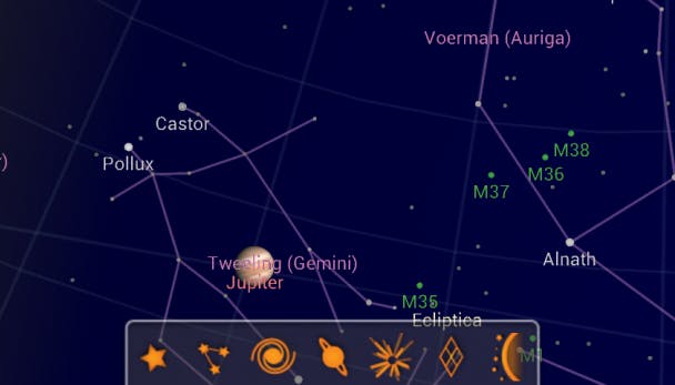 Een tik op het scherm opent het optiemenu. De digitale sterrenhemel is zo minder druk te maken, door bijvoorbeeld sterrenstelsels en sterrenbeelden uit te schakelen. Je kunt ook de nachtmodus inschakelen, het scherm geeft dan minder licht. Zo zie je met je eigen ogen nog meer in de donkere lucht, omdat je ogen zich aanpassen aan de lichtomstandigheden. Geen zin om je mobieltje steeds te moeten positioneren met drukke armgebaren? Druk op het witte veeg-logo en kies voor de handmatige navigatiemodus.