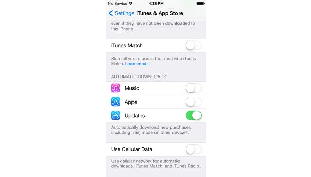 Standaard downloadt iOS 7 alleen automatische updates wanneer je een Wi-Fi verbinding hebt, maar als je dat echt wilt kun je ze ook via een mobiel netwerk downloaden. Om dit te doen, zoek naar de knop Use Cellular Data in het iTunes & App Store instellingenscherm en verschuif deze naar rechts. Helaas is dit een alles-of-niets instelling: Je kunt je iPhone niet vertellen om iTunes Radio te streamen terwijl je op een mobiel netwerk zit maar automatische app updates uit te schakelen wanneer je geen Wi-Fi verbinding hebt, dus wees voorzichtig als je geen onbeperkt datapakket hebt.