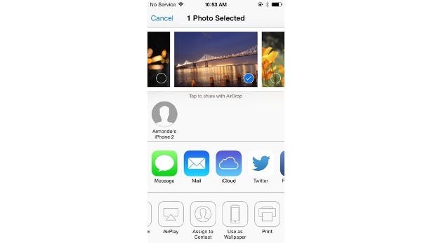 Open vervolgens een app die delen via AirDrop ondersteunt - laten we in dit geval de Photos app als voorbeeld gebruiken. Open een foto, en zoek naar de knop met een omhoog wijzend pijltje. Als de andere persoon AirDrop ingeschakeld heeft en zich in de buurt bevindt zou hij of zij bovenaan in het paneel tevoorschijn moeten komen. Druk op de naam van degene met wie je de foto wilt delen, en hij of zij krijgt een berichtje met de vraag of de foto geaccepteerd moet worden. Als de andere persoon op Accept drukt, zal je telefoon de foto naar zijn of haar telefoon versturen.