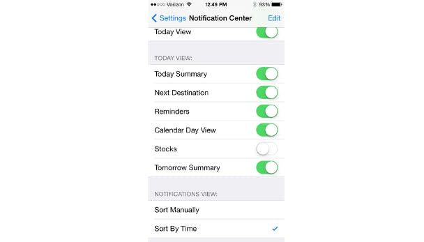 Je kunt de volgorde waarin de items verschijnen aanpassen - maar op beperkte wijze. Druk op Edit in de rechterbovenhoek van het instellingenscherm van het Notification Center en versleep de items met de "grabbers" - de drie lijnen naast elk item in de lijst. Je kunt alleen de Calendar Day View, Reminders en Stocks herorganiseren; de andere onderdelen blijven op hun plek staan. Druk als je klaar bent op Done.